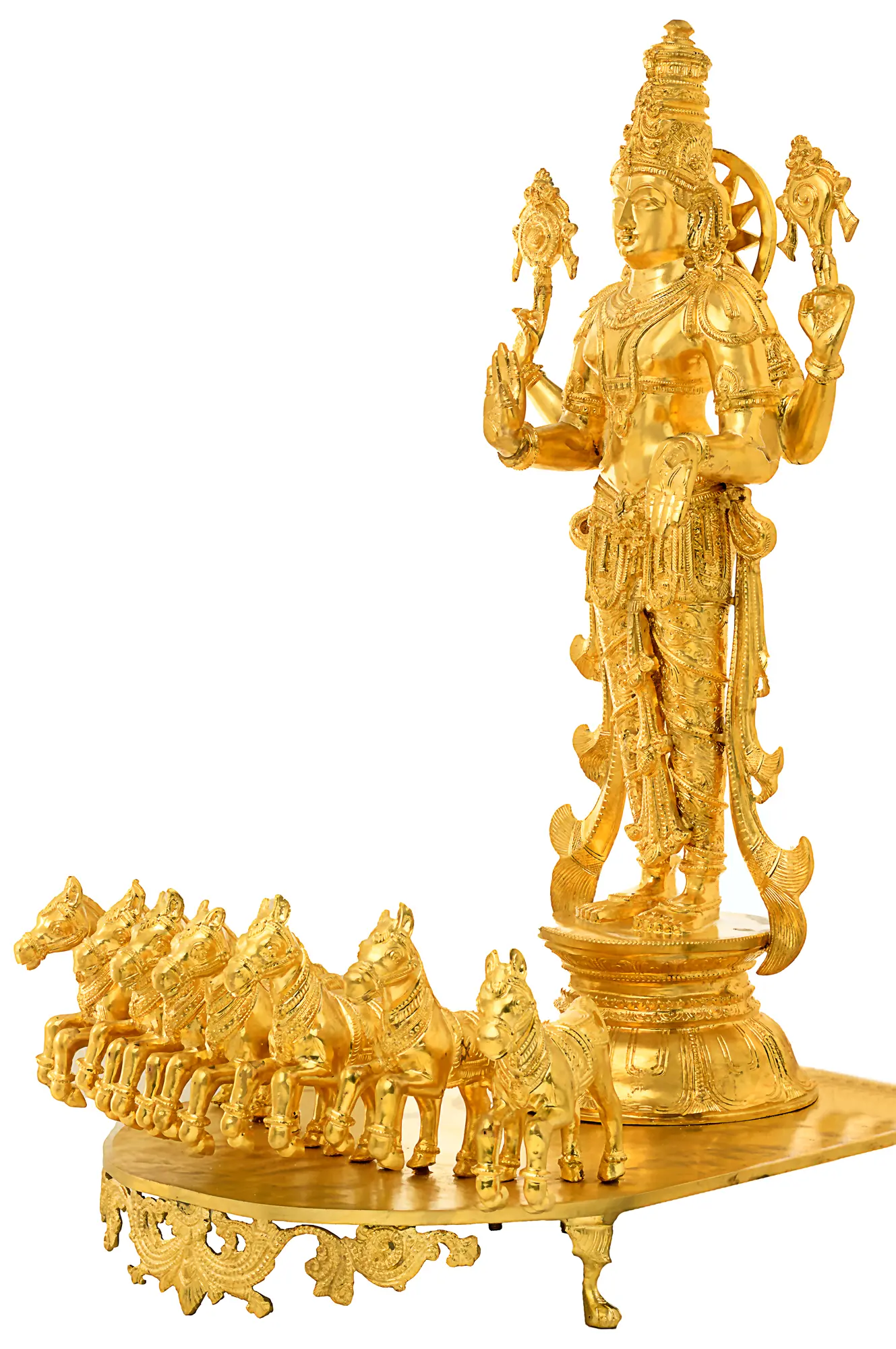 The Lord's physique is graciously slender, its proportions supremely balanced. The aspects of symmetry prevalent in the splendidly fashioned dhoti and the cascading sash on either side below the navel, are soothing to the eye. Note the seven gorgeously embellished horses before His pedestal, which symbolise the seven days of the cyclical week.