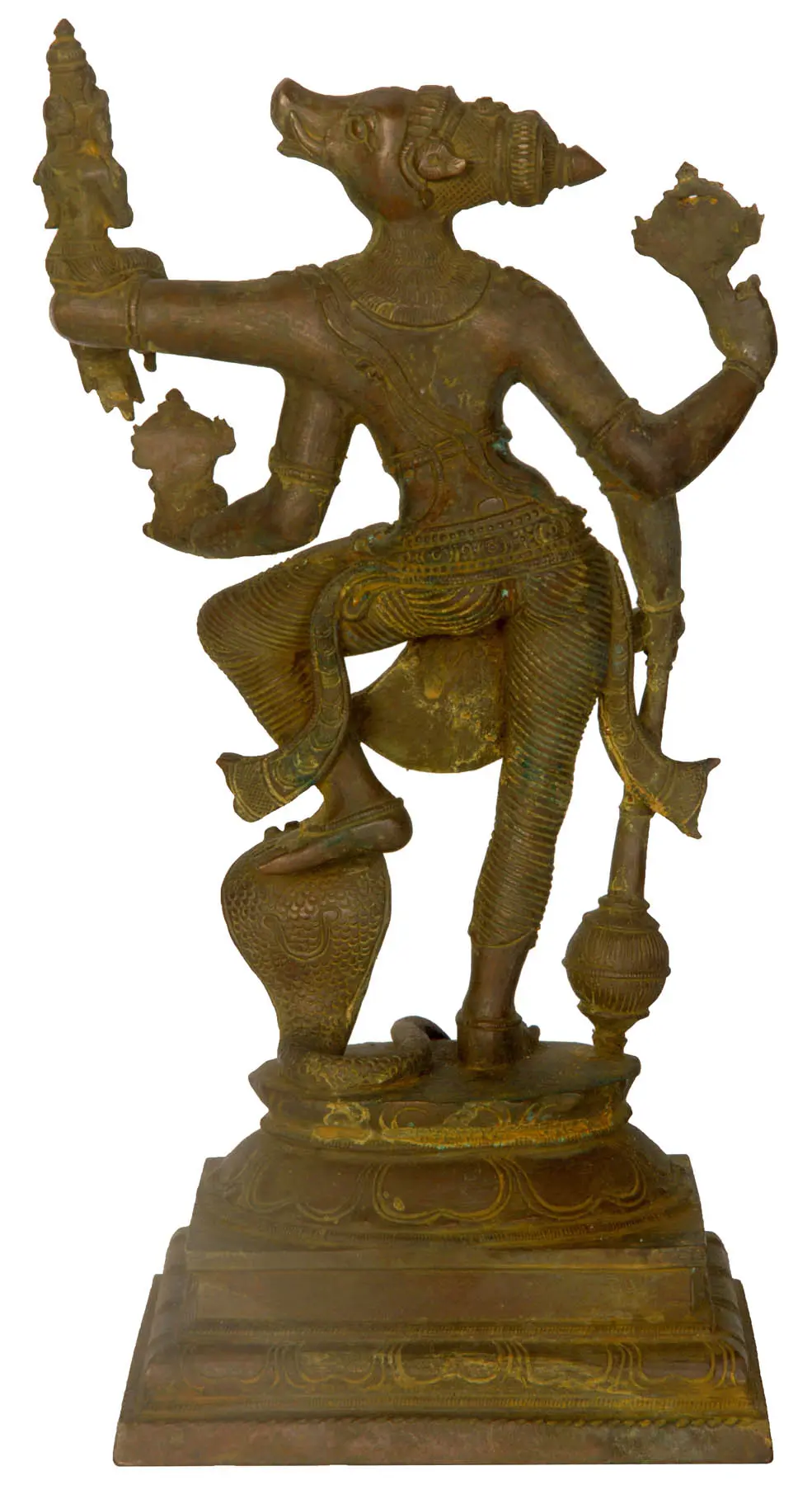 Zoom in on the superhuman strong and virile form of Lord Varahavatara Vishnu. Fashioned from bronze, the same is overlain with a world of divine adornments that start from the crown on His head to the jewels on His limbs and torso. Finally, the iconography of the graceful Bhudevi has been kept intact despite Her being a fraction of the whole composition in terms of scale.