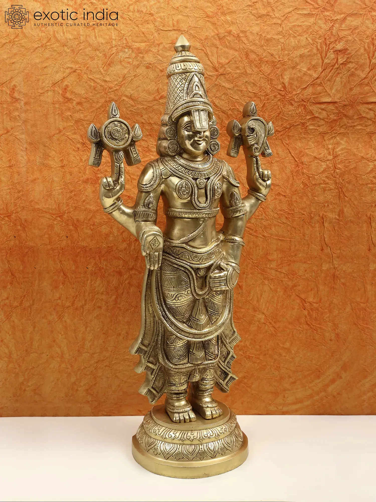 This standalone Balaji murti comes in three different patinas/colour finishes. The devotee may choose from amongst them the one that goes best with their personal visualisation of the Tirupati deity or with the interiors of their temple.