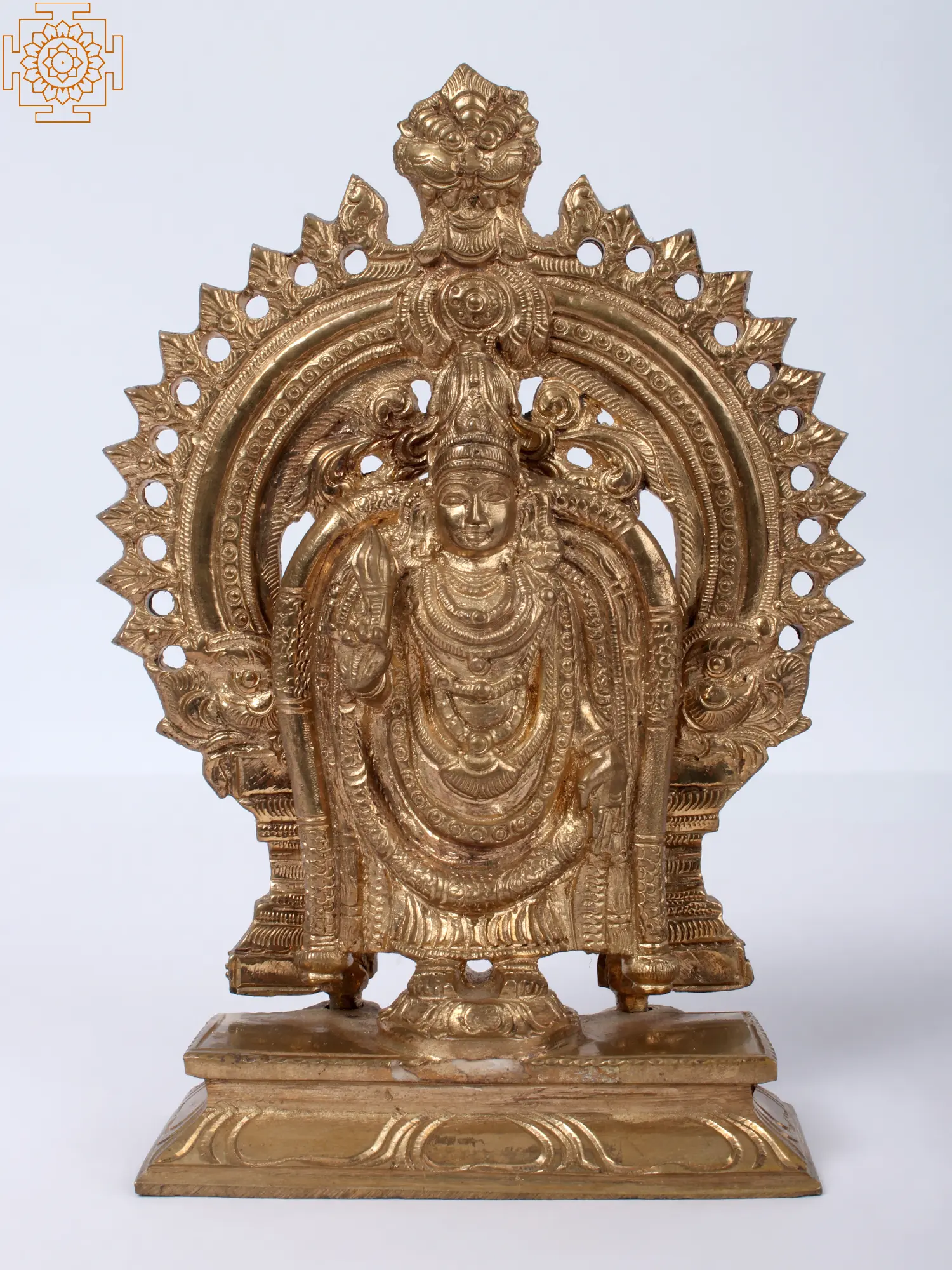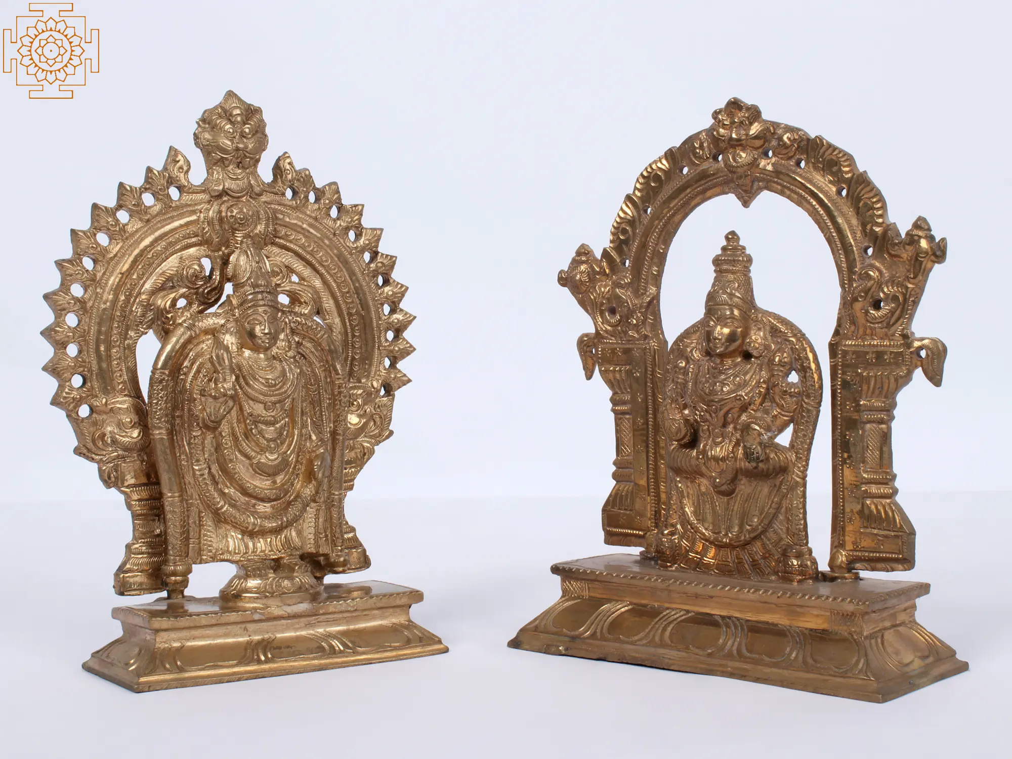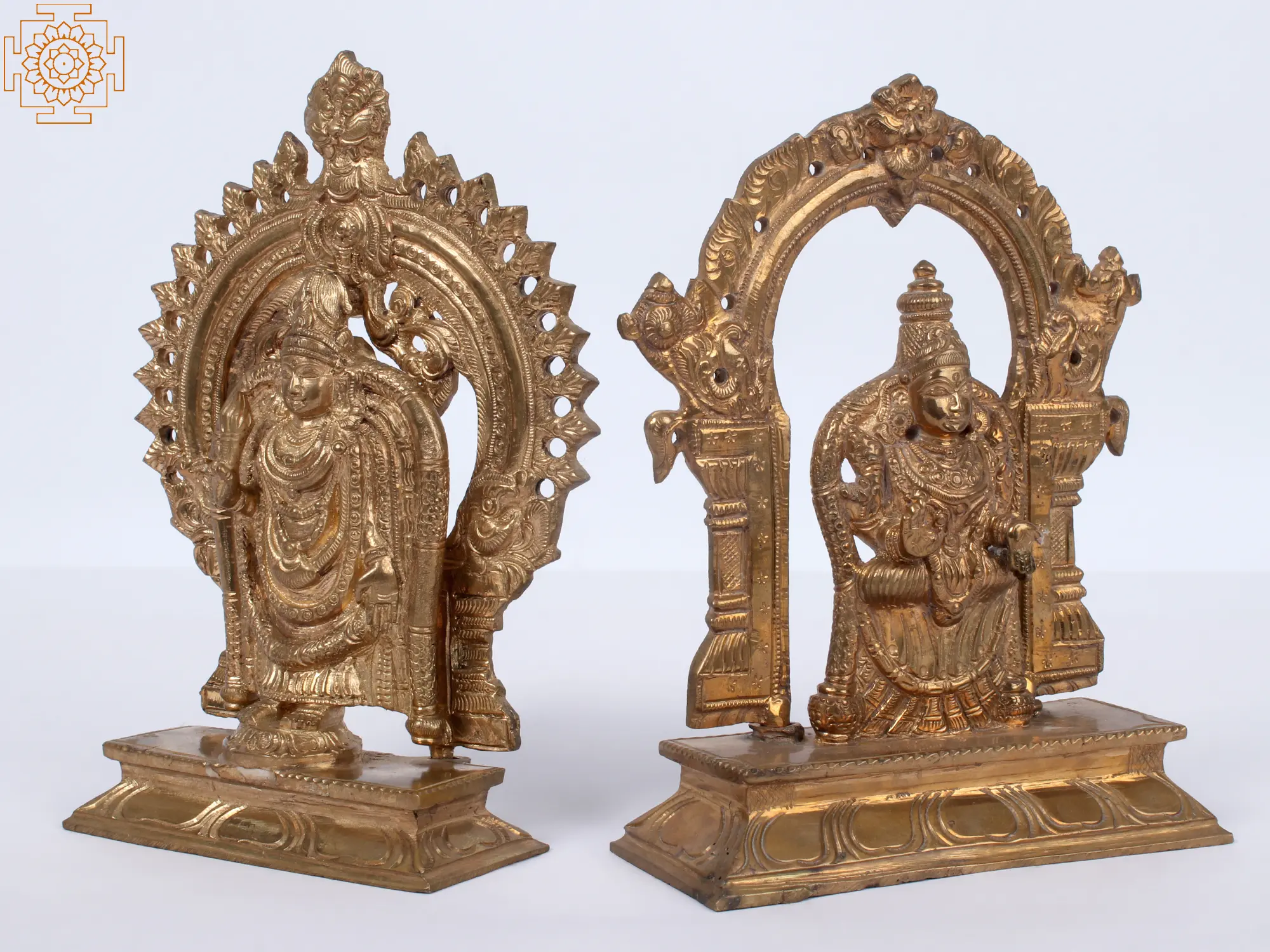 This bronze statue is a reflection of the deep-rooted devotional practices and the enduring artistic traditions of South India. Each element, from the delicate detailing of the deities' attire to the symbolic motifs present in the base and the surrounding arch, is imbued with religious significance. The warm, lustrous patina of the bronze adds to its timeless appeal, making it a treasured heirloom for generations to come. Placing this statue in your home or sacred space is an invitation for divine grace, prosperity, and spiritual peace. It serves as a constant reminder of the divine presence that watches over and blesses us, fostering an environment of harmony and well-being. This piece is not merely a decorative item but a profound expression of faith and a connection to the ancient spiritual lineage.