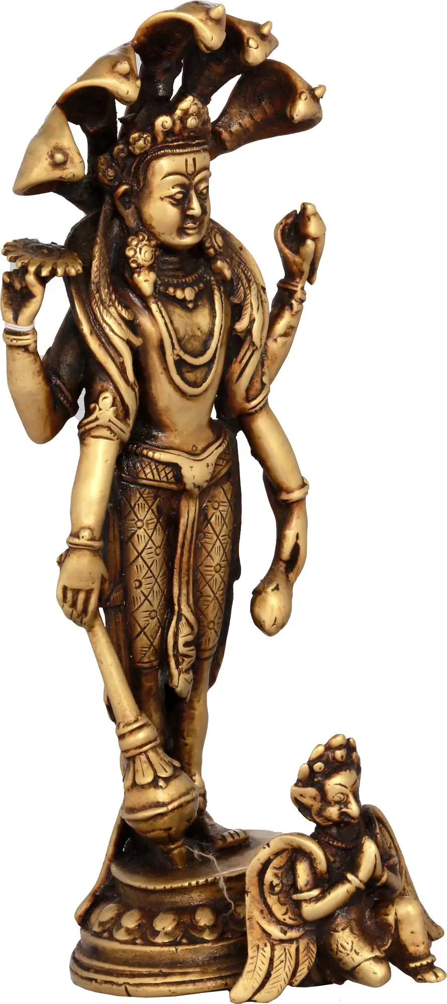Hailing from Nepal, a land steeped in spiritual traditions and renowned for its masterful artistry, this brass sculpture is a testament to the enduring legacy of Himalayan craftsmanship. Nepalese artisans have for centuries created sacred objects that are not only aesthetically beautiful but also imbued with deep spiritual significance. The techniques employed in creating such pieces are often passed down through generations, ensuring the preservation of traditional methods and the highest quality of execution. This sculpture, with its fine detailing and lustrous brass finish, captures the essence of devotion and artistic excellence, making it a captivating addition to any sacred space or discerning collection. The representation of Vishnu on his vahana, Garuda, the divine eagle-man, as depicted at the base, signifies speed, power, and victory over obstacles. Garuda is the eternal foe of the Naga, symbolizing Vishnu's ultimate triumph over darkness and chaos.