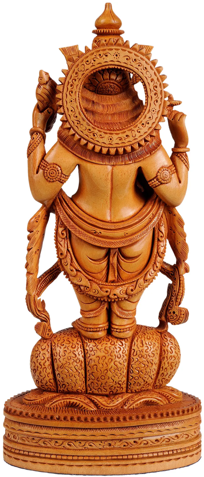 Behold a meticulously carved representation of one of Hinduism’s most revered deities. This exquisite sculpture embodies a profound narrative from Hindu cosmology, brought to life with careful detail and craftsmanship. More than just an artistic piece, it serves as a tangible link to a timeless story, inviting contemplation and reverence. Crafted from Kadamba wood, its smooth texture and warm tones enhance the intricate details of the deity and the serpent upon which he stands. The artisan's skill is evident in every curve and contour, capturing the essence of divine serenity and power. This statue radiates a sense of peace and protection, making it an ideal addition to any sacred space.