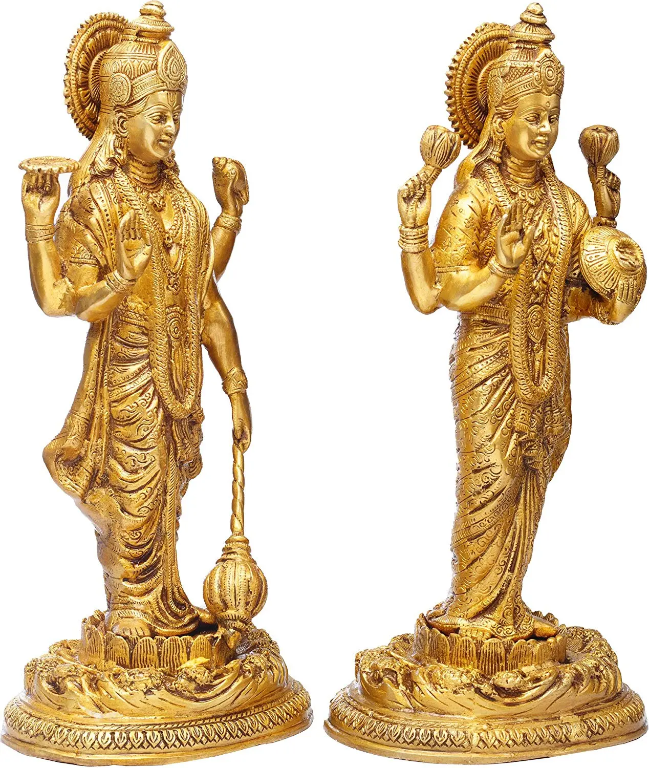 This statue is a testament to masterful craftsmanship. Each detail, from the intricate carvings on their garments to the serene expressions on their faces, has been meticulously rendered in solid brass. The choice of brass is significant; it is considered a sacred metal in Hindu traditions, believed to possess purifying qualities and attract positive energy. The statues are designed to stand gracefully, each on a lotus base, a powerful symbol of spiritual awakening and purity amidst the material world. Lord Vishnu holds his characteristic mace (Gada), representing power and authority, while Goddess Lakshmi holds lotus flowers, symbolizing purity and abundance. The divine radiance of the brass is further enhanced by the detailed ornamentation that adorns their divine forms, reflecting their celestial status.