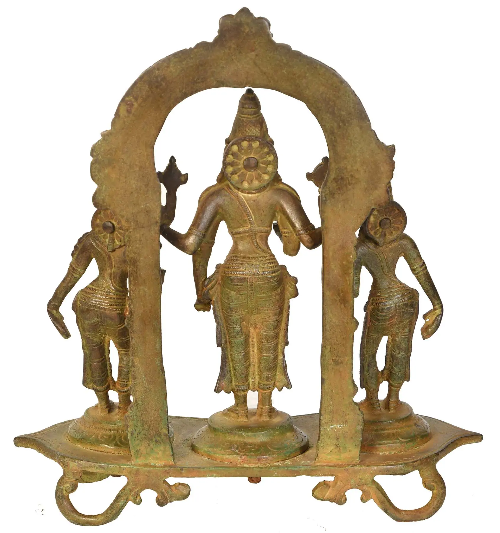 This exquisite brass statue depicts Lord Vishnu in his benevolent form, flanked by his divine consorts, Shridevi and Bhudevi. The central figure of Vishnu is rendered with four arms, a common representation symbolizing his omnipotence and omnipresence. His serene countenance exudes peace and grace, inviting devotion and contemplation. Shridevi, the goddess of wealth and prosperity, stands to his right, while Bhudevi, the goddess of the Earth, graces his left. Together, they represent the harmonious balance of material and spiritual abundance that Vishnu upholds. The intricately detailed craftsmanship, evident in the delicate ornamentation and flowing drapery, speaks to the skill of the artisan and the reverence with which the deities are portrayed.