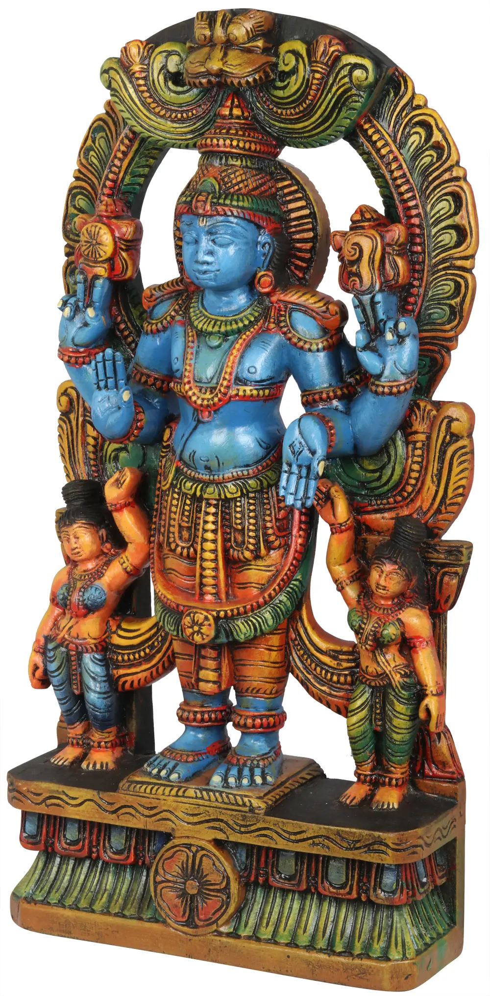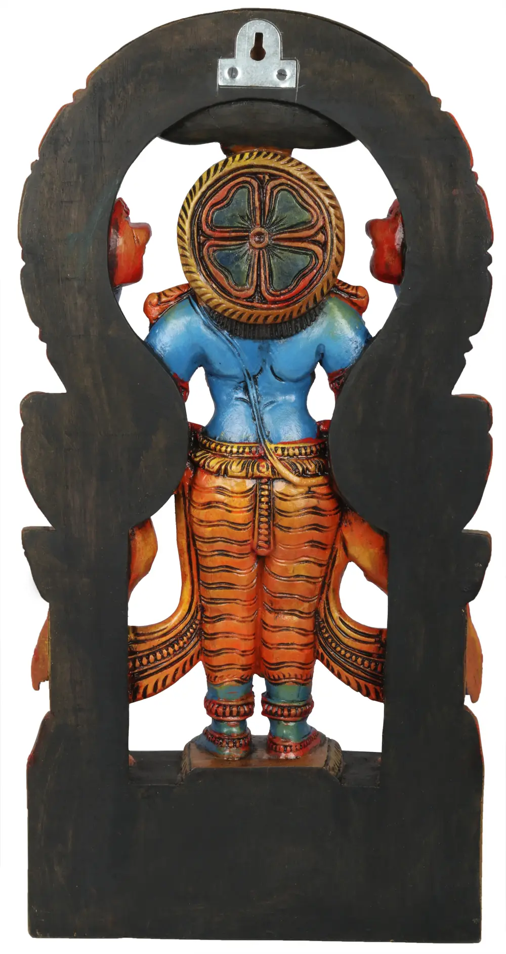 This beautiful carving captures a serene representation of the deity, reflecting the deep understanding and reverence held by the artisans who created it. Notice the intricate details of the headdress, the ornamentation, and the subtle expressions etched onto the face. The use of vibrant colors, a hallmark of South Indian temple art, further enhances the divine presence and brings life to the sculpture. The unique style showcases the meticulous detail and artistic traditions of the region. Carved from wood, each piece is a testament to the skills and dedication of the artists. The careful attention to detail is reflected not only in the main figure but also in the smaller figures that adorn the sculpture, creating a harmonious composition. This hand-carved piece is more than just a decorative object; it is an embodiment of faith, tradition, and artistic excellence.