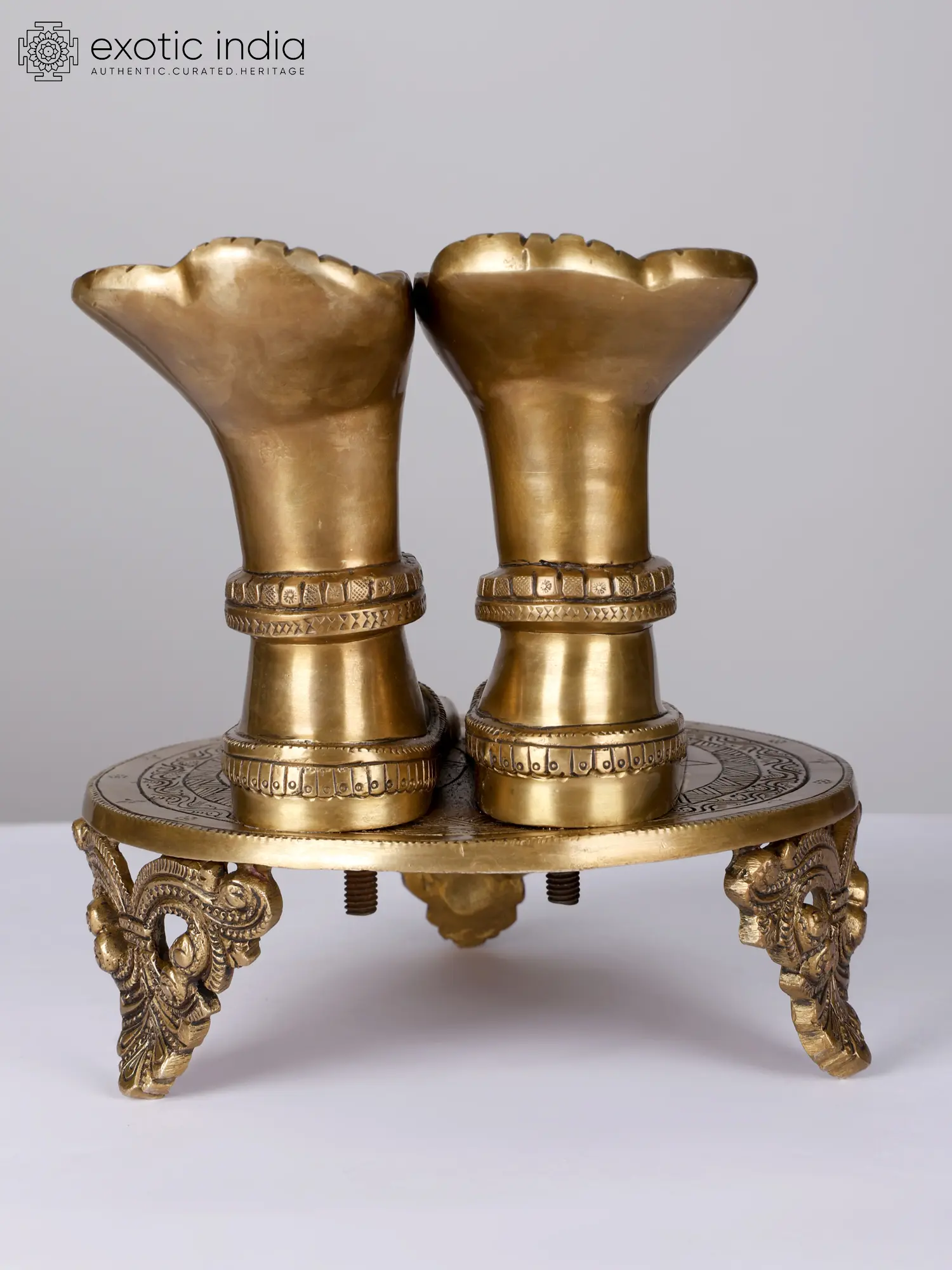 This brass sculpture represents the idea of lotus feet beautifully, with the Charan-Kamala or Padma-Pada of Lakshmi placed on an ornate Peetha (pedestal). Decorated with anklets, toe rings, and sacred designs- all signs of auspiciousness and femininity, the feet of Lakshmi bloom into two delicate flowers.