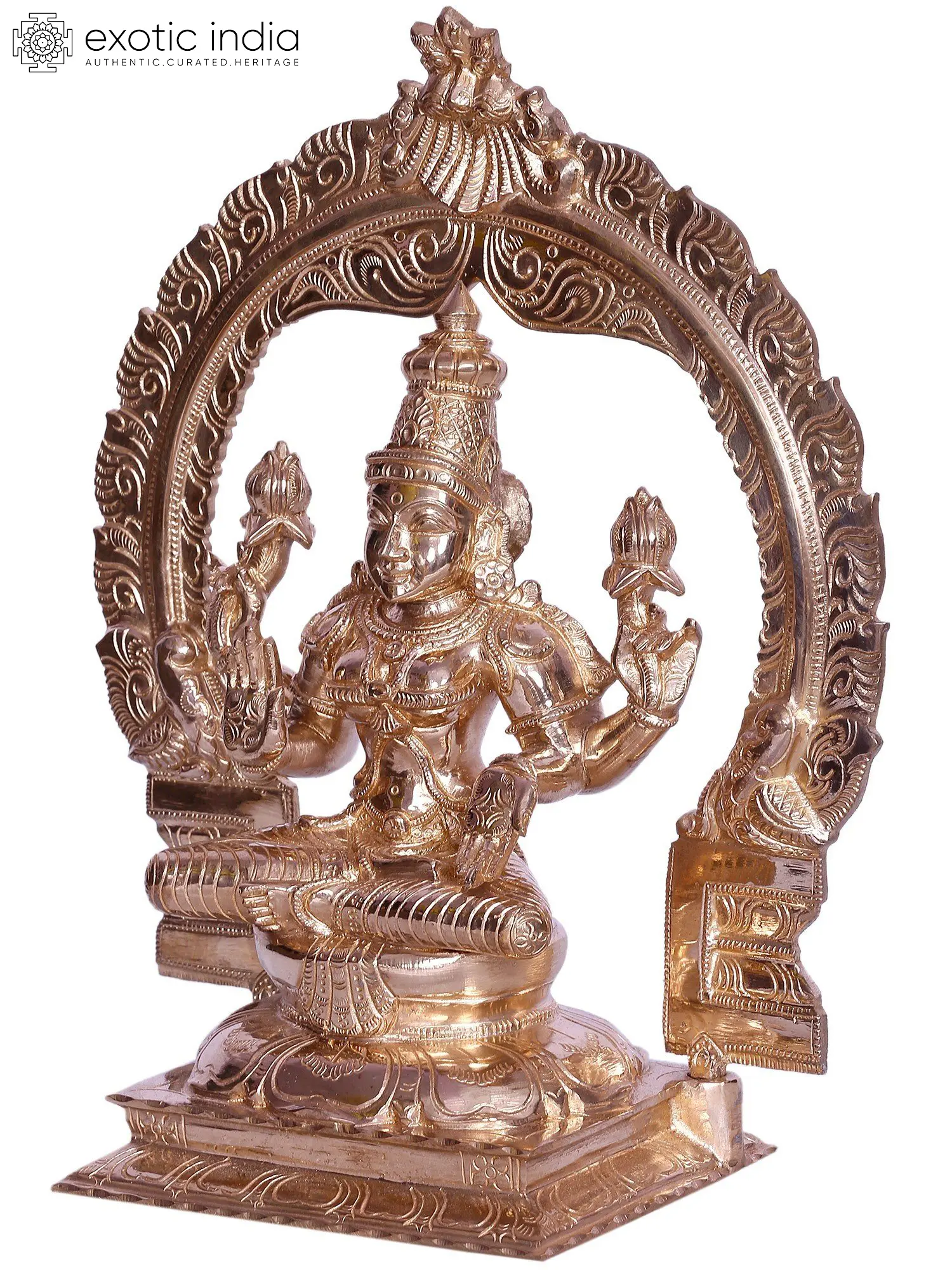 Goddess Lakshmi, “also known as Padmamukhi”, the divine enchantress, graces her lotus pedestal, adorned in celestial splendour. Padmamukhi, “the Lotus-Faced”, radiates benevolence from her eyes, cradling a lotus in ethereal grace. Her hands, one bestowing fearlessness (Abhaya Mudra), the other abundant blessings (Varada Mudra), weave a symphony of cosmic harmony. A regal “Karanda Mukut” adorns her brow, symbolising sovereignty over realms. In worshipping this form, seekers invite prosperity, seeking not just material wealth but the wealth of virtue, wisdom, and spiritual abundance. Crafted in Panchaloha bronze from “Swamimalai” using the ancient “Madhuchista Vidhana (Lost-Wax) technique”, this divine creation embodies the cosmic rhythm, urging devotees to cultivate virtues and tread the path of righteousness, where true wealth is found.