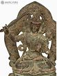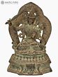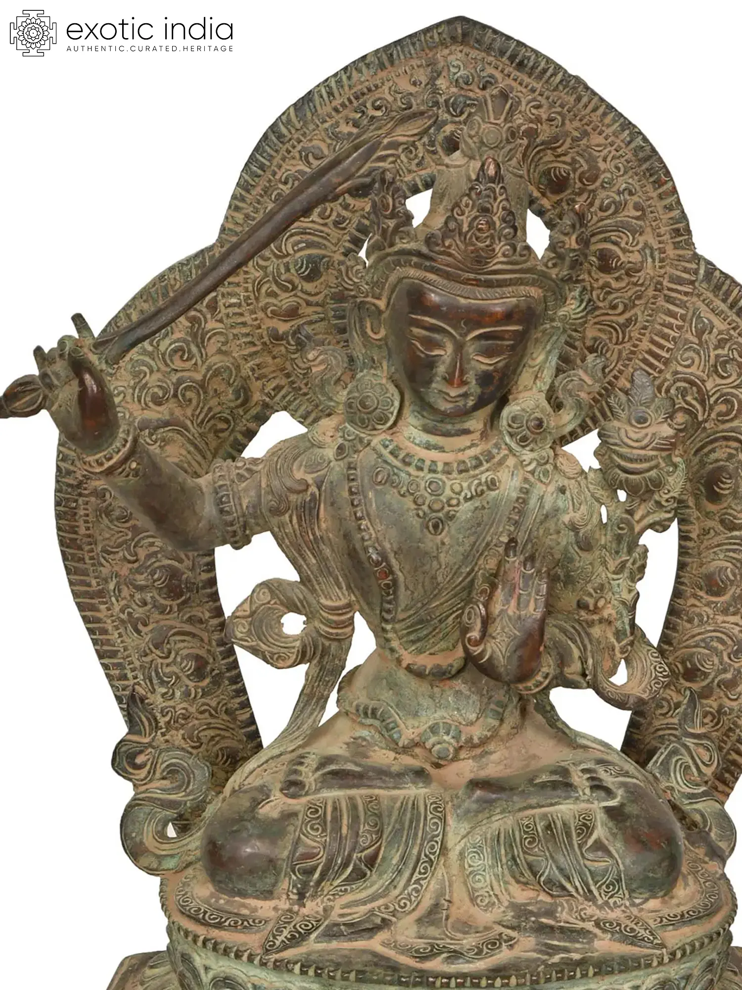 Carrying a stunning aesthetic with its antique appearance, this statue from Nepal belongs to the Bodhisattva Manjushri, the wielder of the sword with which he slays the negative forces from the lives of his devotees, and removes ignorance to let the light of enlightenment shine. In this exquisite icon, Manjushri is enthroned on a majestic throne, on a double-layered lotus seat called Vishwapadmasana. A Tibetan-style aureole attached to the seat adds grandeur to the image, which Manjushri with his celestial countenance seems to be enlivening with his presence.