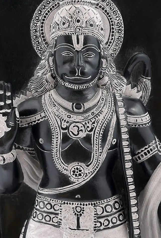 Embrace the divine presence of Lord Hanuman, the devoted servant of Lord Rama and an embodiment of unparalleled strength, loyalty, and courage. This exquisite stone carving, hailing from the renowned artisan hub of South India, specifically Mahabalipuram, captures the very essence of this revered deity. The dark, polished stone serves as a striking canvas, enhancing the intricate details and the divine aura of Hanuman. Each line and curve has been meticulously sculpted, bringing to life a figure that radiates power and unwavering faith.