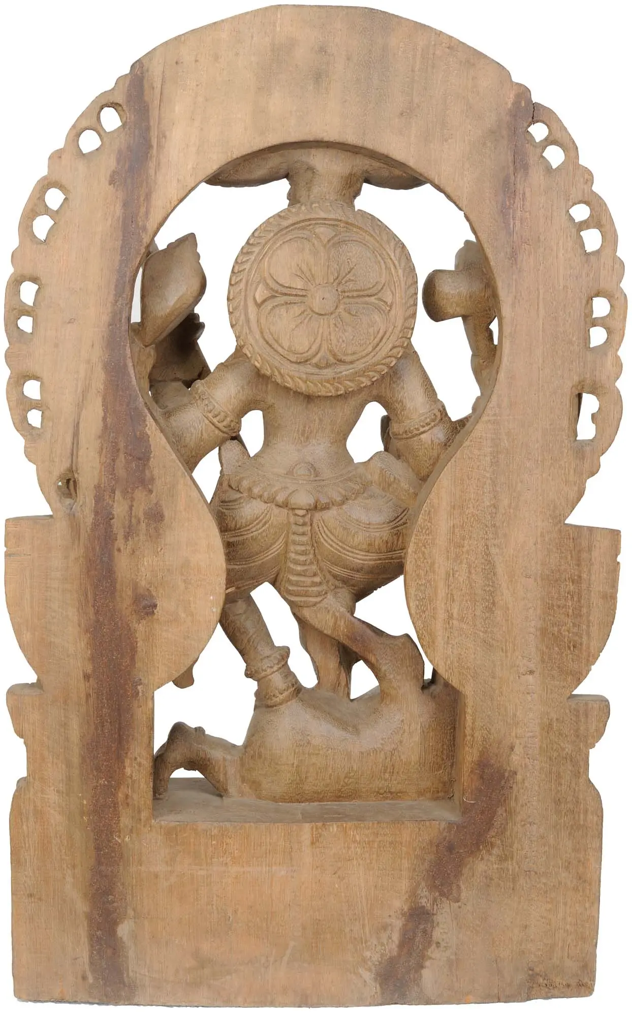 This piece is a testament to the rich heritage of South Indian wood carving. Artisans, drawing upon generations of knowledge and spiritual devotion, have meticulously brought this divine form to existence. The warm, earthy tones of the wood, likely a resilient hardwood known for its durability and ability to hold fine detail, lend a sense of age-old wisdom and grounded power to the sculpture. The carving showcases the characteristic stylistic elements of South Indian temple art, often characterized by bold lines, detailed ornamentation, and a profound sense of movement and dynamism. The ornamentation on Durga's attire and the decorative arch behind her are rendered with precision, reflecting the painstaking effort that goes into such devotional craftsmanship. The base, adorned with symbolic motifs, provides a sturdy foundation for the celestial drama unfolding above. The portrayal of Durga as Mahishasur Mardini is not merely an artistic representation but a visual sermon. It signifies that no matter how insurmountable the challenges may seem, the inner strength and divine grace can overcome any adversity. The Goddess, in her many forms, represents the protective, nurturing, and fierce aspects of the universal mother. Her victory over Mahishasur is celebrated as a reminder that righteousness will always prevail, and that the power of faith and devotion can empower even the seemingly weak to conquer the strongest of evils. Owning this sculpture is like inviting that divine energy and timeless message of hope and resilience into your sacred space.