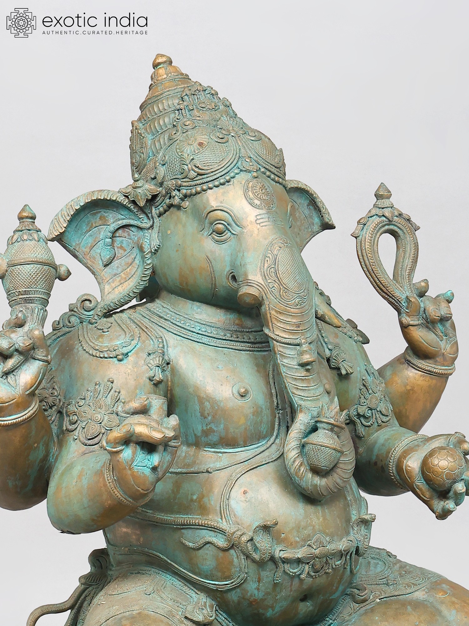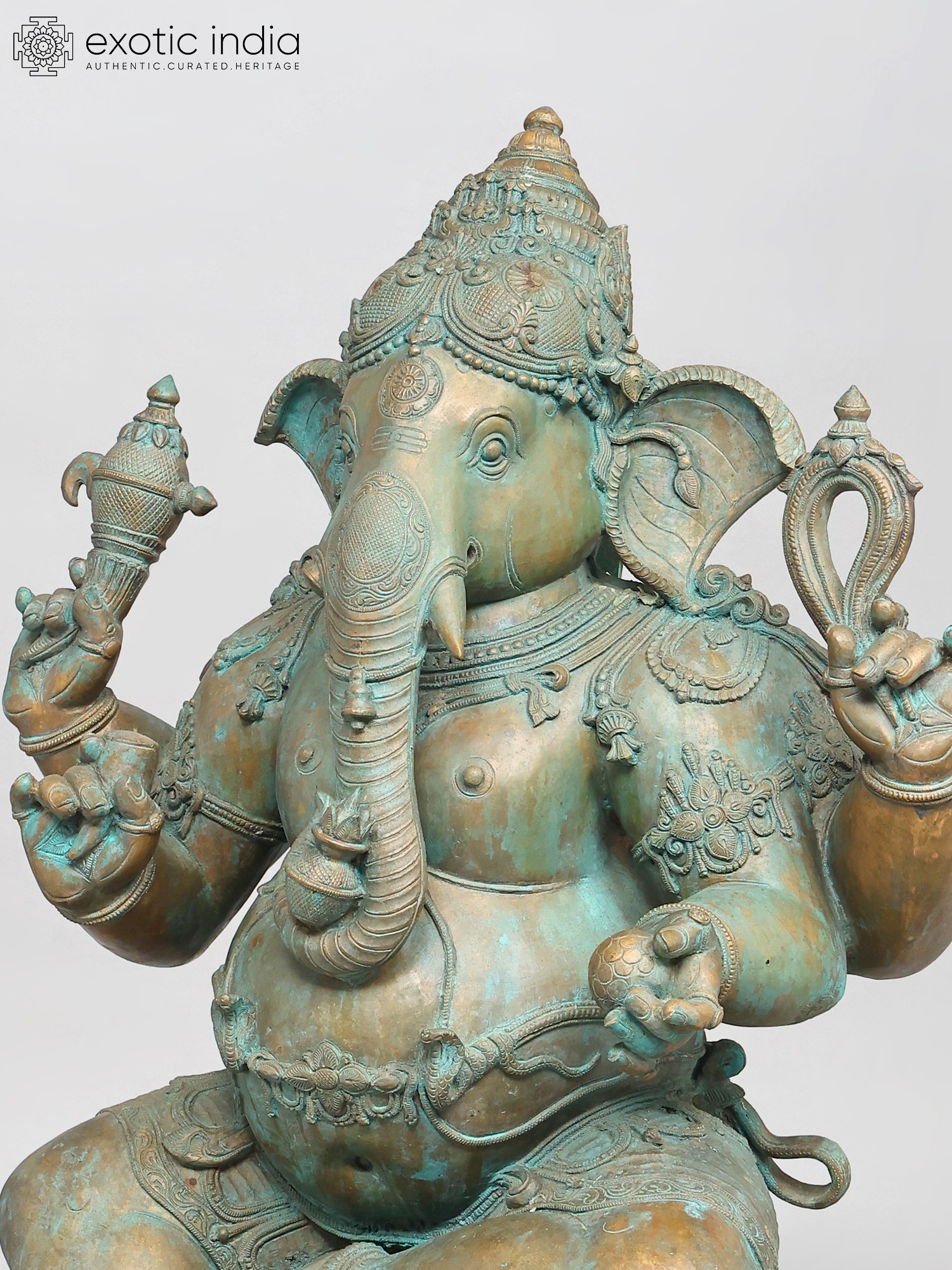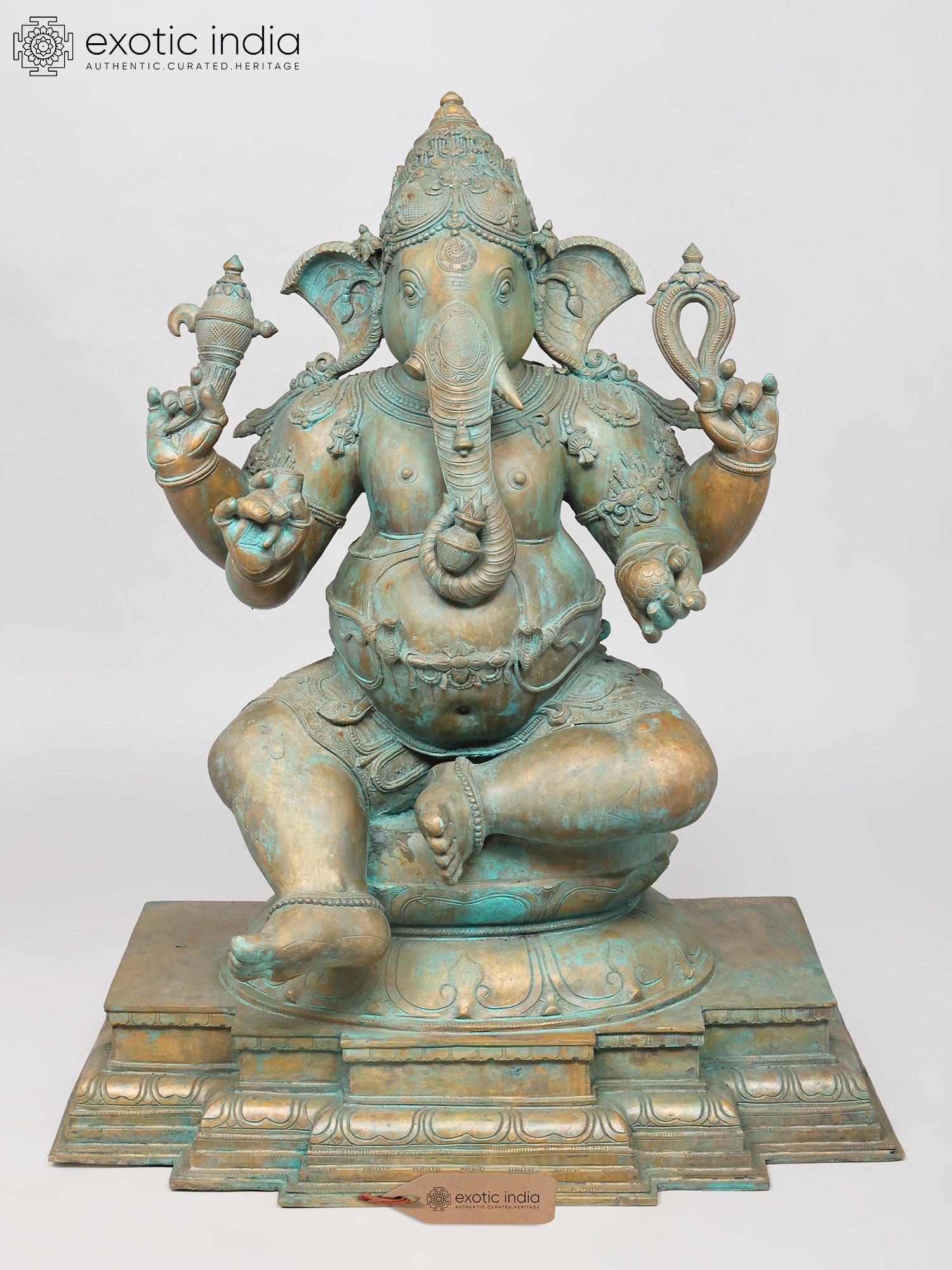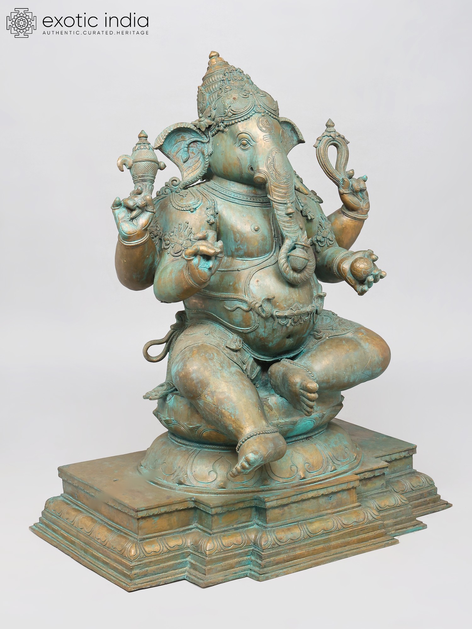 This magnificent bronze sculpture captures the divine presence of Lord Ganesha, the beloved elephant-headed deity, seated serenely upon a blooming lotus pedestal. Standing at an impressive height, this artwork is a powerful testament to the enduring artistry and spiritual depth of Indian craftsmanship. The lustrous patina of the bronze, achieved through traditional methods, lends an air of timeless grandeur to the piece, making it a focal point of any sacred space or discerning collection. Each curve and contour of the sculpture is rendered with meticulous detail, from the gentle sway of Ganesha's trunk to the intricate ornamentation adorning his limbs.