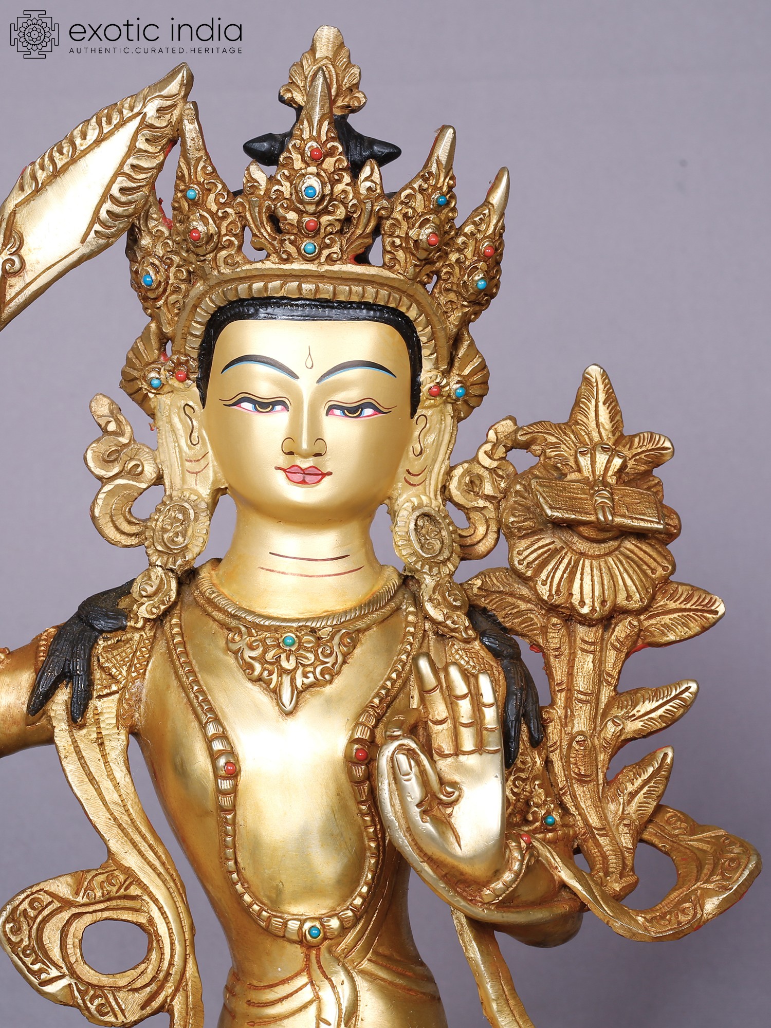 13" Buddhist Deity Manjushri Idol from Nepal | Copper Statue Gilded with Gold