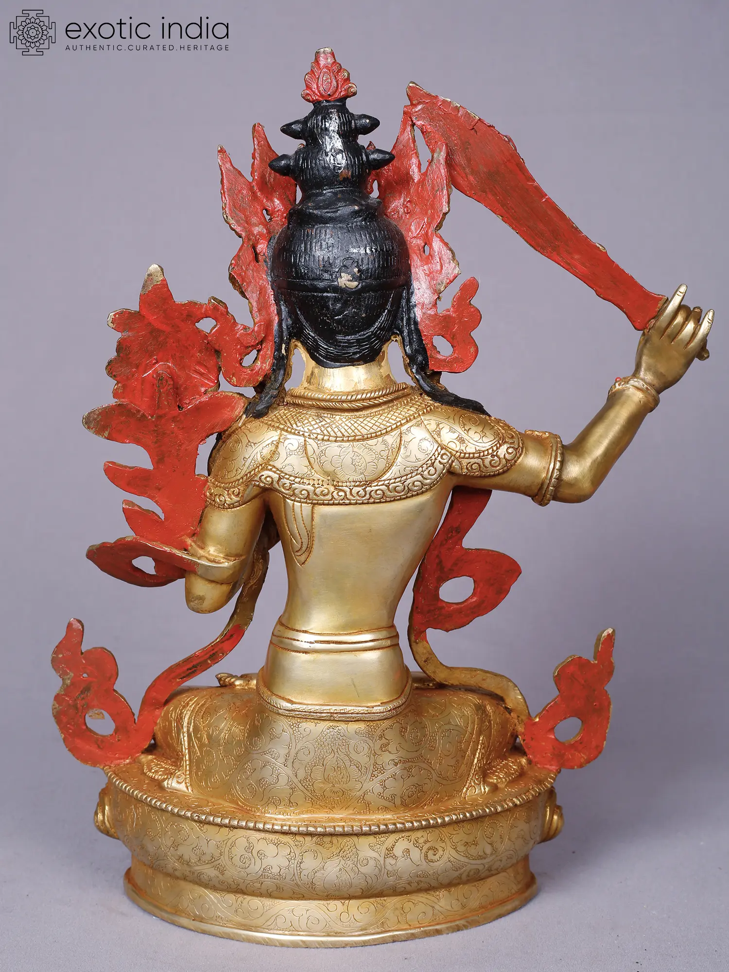 13" Seated Manjushri Idol with Sword | Gilded Copper Statue from Nepal