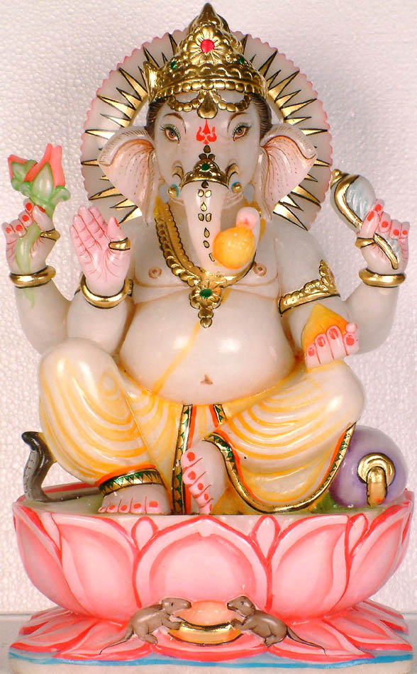 Elevated over a beautifully conceived and carved lotus this marble image of Lord Ganapati reveals rare beauty, great magnificence and exceptional lustre. Besides two lotus buds carried in his upper right hand he is carrying in the upper left, a conch, the normal right is held in ‘abhaya’ and the normal left carries a ‘laddu’. The image has used little ornamentation and attains the highest level of magnificence in its medium marble and judiciously laid brilliant colours. He is wearing an elegant crown inlaid with multi-coloured precious stones. The sole ensemble that he is putting on is his ‘antariya’ with fine artistic pleats defined by colouring the chiseled courses. The lotus seat and the tiny lustrous bolster under his left thigh are two most beautiful components of the image.
