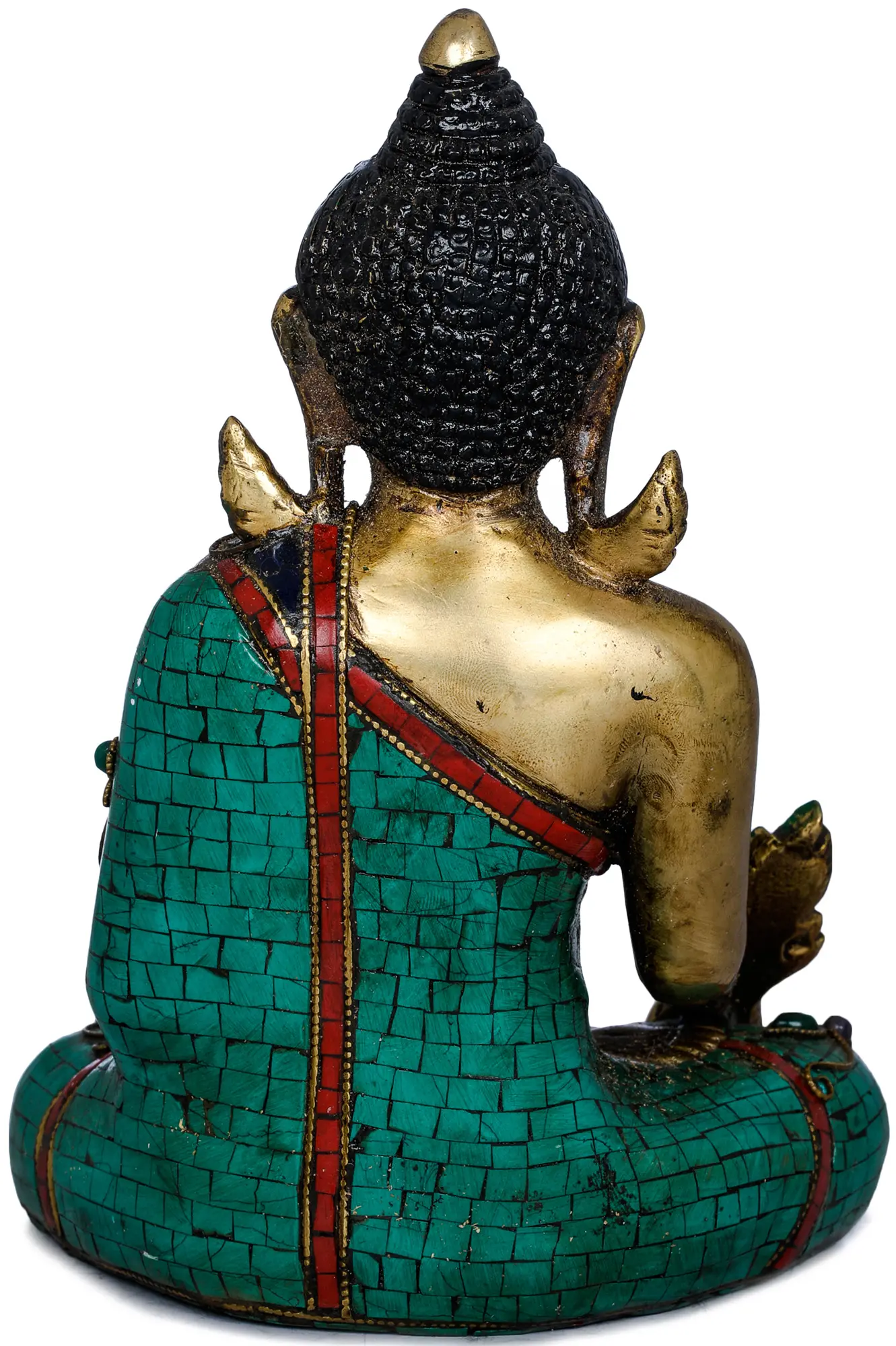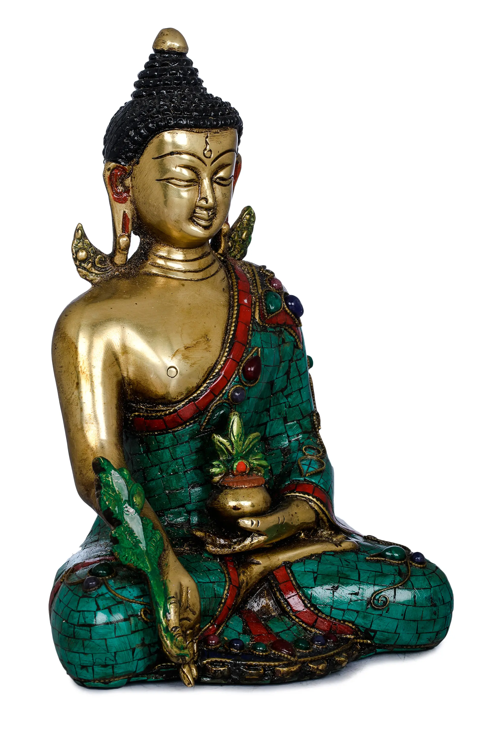 Crafted from high-quality brass, this statue showcases the intricate artistry of Nepalese artisans. The vibrant inlay work, featuring a mosaic of turquoise-colored stones and accents of deep red and amethyst hues, adorns his monastic robes and the base. These gemstones not only enhance the visual splendor of the statue but are also believed to carry their own energetic properties, further amplifying the aura of healing and protection. The textured depiction of the robes adds a sense of depth and realism, making the figure appear almost lifelike. The Medicine Buddha's presence is said to purify the environment and ward off negativities. In Tibetan Buddhism, the contemplation of the Medicine Buddha is a significant practice for overcoming illness and cultivating compassion for oneself and others. Legend has it that the Medicine Buddha, in a past life as a Bodhisattva, made twelve great vows, including the vow to eliminate all forms of suffering and sickness from the world. His teachings and emanations are believed to offer relief from the endless cycle of rebirth and the attendant suffering. Placing this sacred image in your home or meditation space can serve as a constant reminder of the power of healing, compassion, and mindful living. It is not merely an object of art but a conduit for spiritual practice and a source of solace and inspiration. Embrace the tranquil and benevolent energy of the Medicine Buddha, and invite profound healing and well-being into your life.