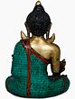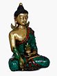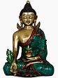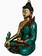 This exquisite brass statue depicts the Medicine Buddha, also known as Bhaisajyaguru, a celestial Buddha in Mahayana Buddhism. He is revered as the master of Vedic medicine, a physician who can alleviate suffering and heal all sentient beings. In Buddhist traditions, the Medicine Buddha is invoked for healing physical, mental, and spiritual ailments. He represents the ultimate physician, whose vows are to cure all diseases and guide sentient beings out of their ignorance, greed, and hatred. The visual iconography of the Medicine Buddha is rich with meaning. In this portrayal, he is seated in the lotus posture, a symbol of purity and enlightenment. His right hand rests on his right knee, palm outward, in the gesture of giving blessings and dispelling fears. His left hand cradles an alms bowl filled with the celestial medicinal herb Arura, symbolizing his healing powers. The serene expression on his face, with eyes gently closed in meditation, conveys profound peace and boundless compassion. The traditional urna, a swirl of hair on his forehead, and the cranial protuberance, representing his great wisdom, are also depicted with meticulous detail.