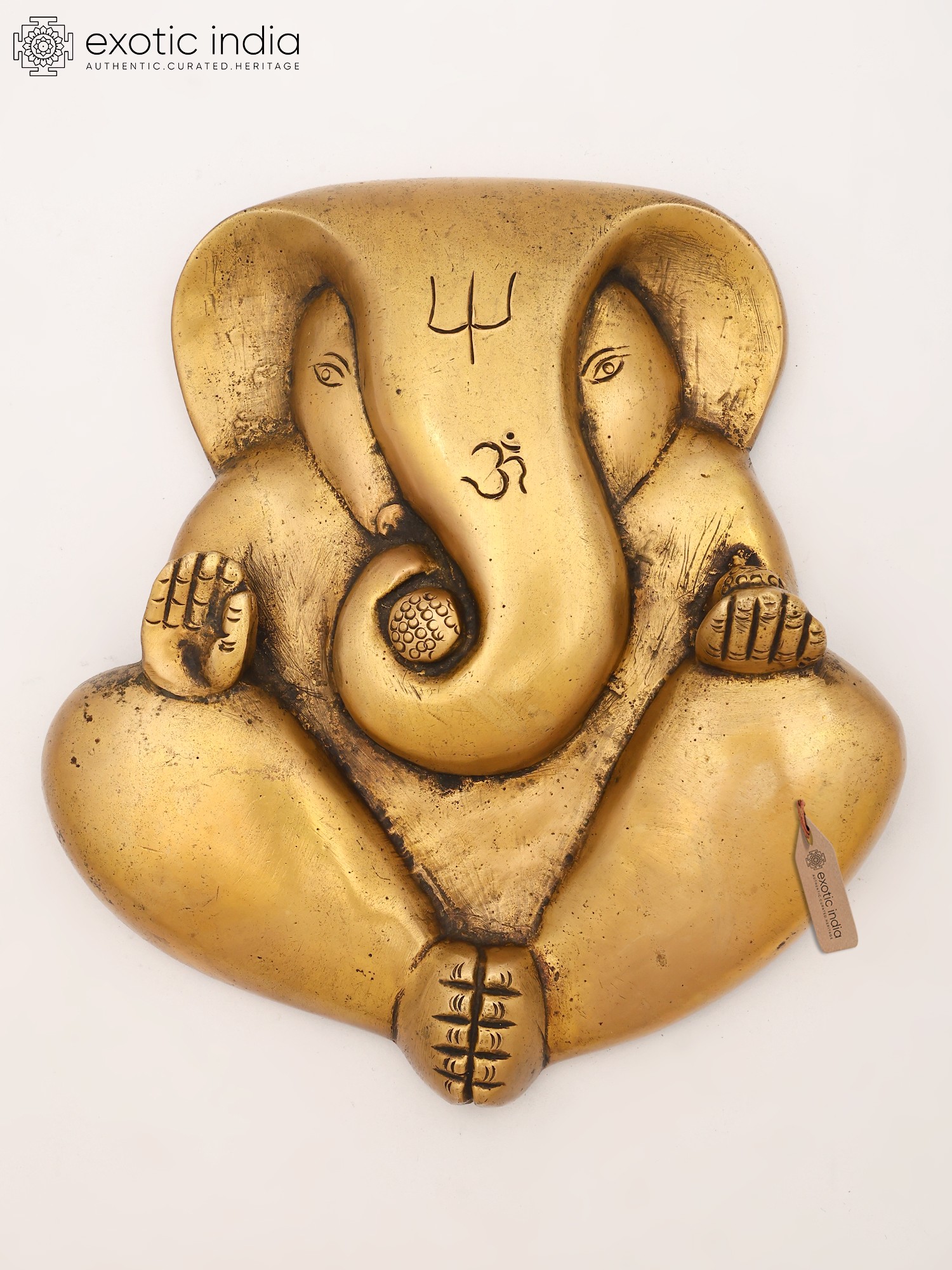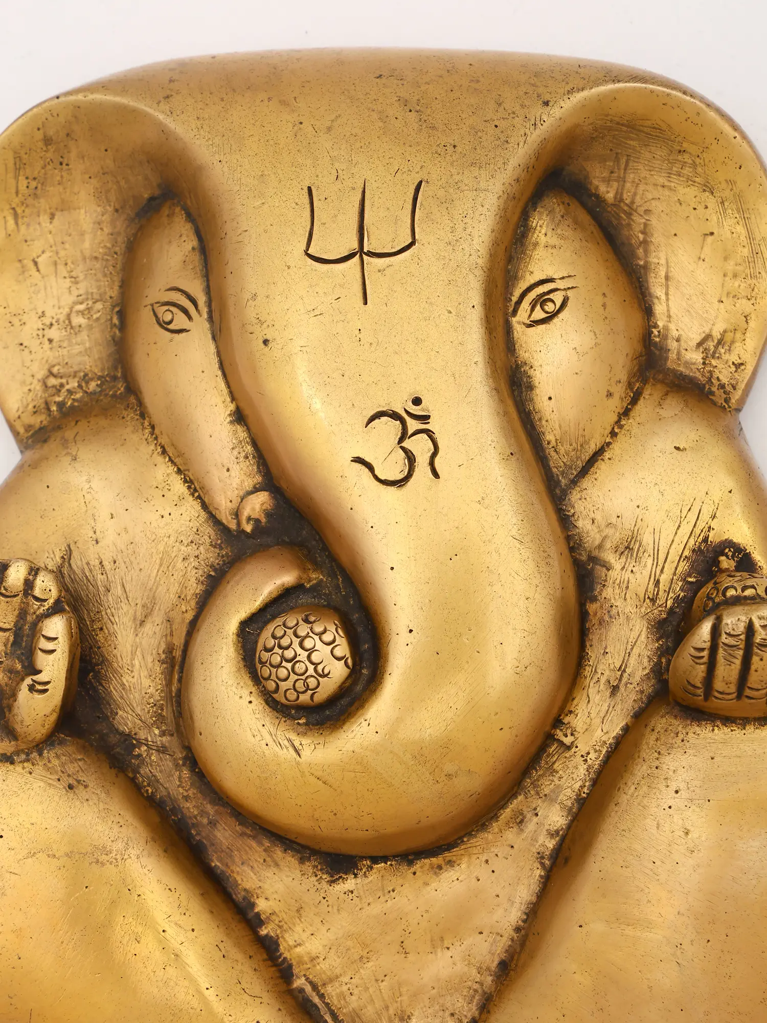16" Stylized Blessing Ganesha | Wood Framed Brass Sculpture | Wall Hanging