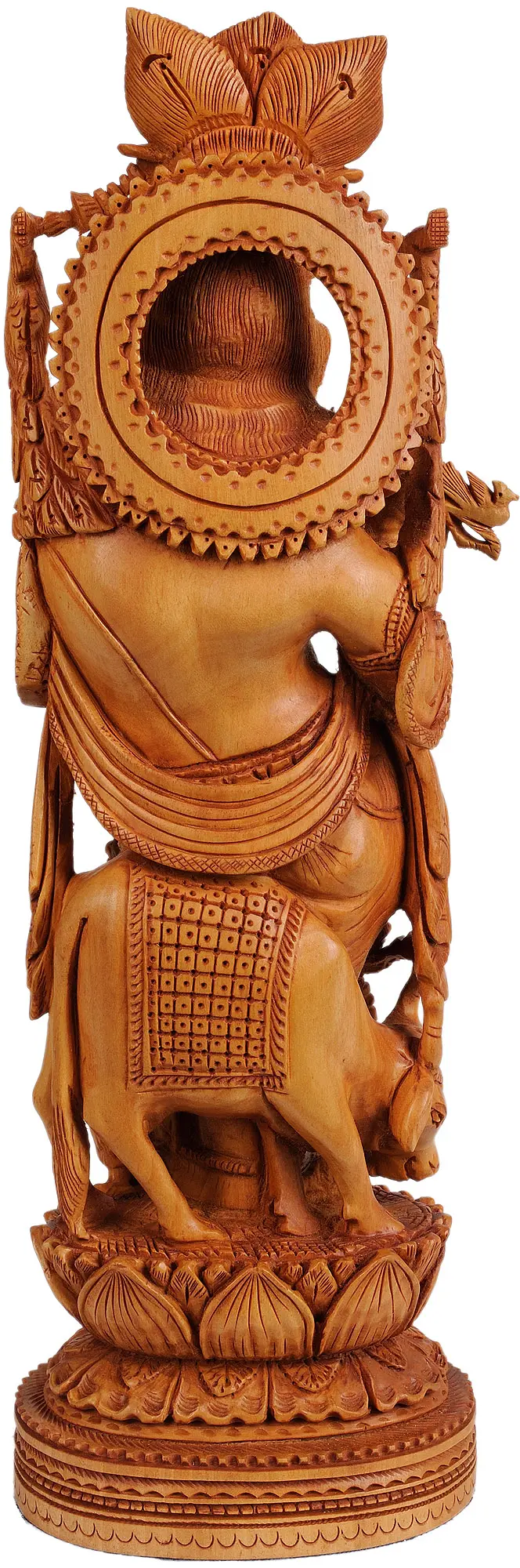 Crafted from Kadamba wood, this statue holds a connection to the landscapes where Krishna's legends unfolded. The Kadamba tree itself is considered sacred in Hindu tradition, often associated with Krishna's playful dalliances in the forests of Vrindavan. The wood's natural grain and warm tones lend a unique character to each piece, ensuring that no two statues are ever exactly alike. This natural material connects the sculpture to the earth and adds a dimension of authenticity.