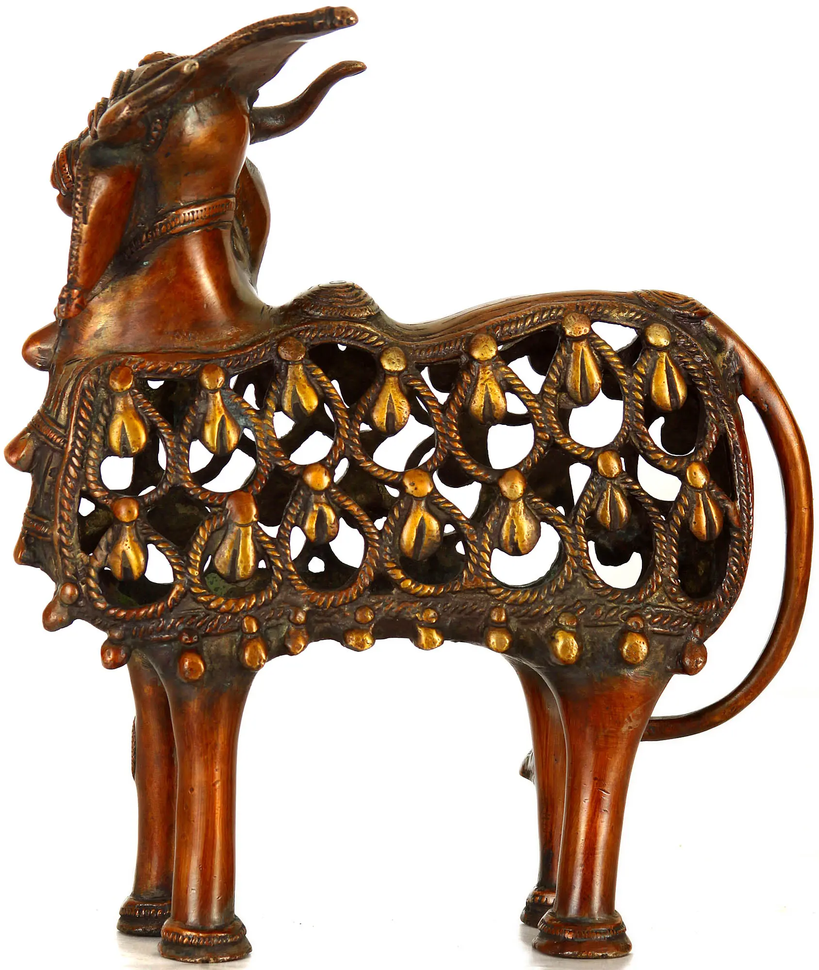 This stunning brass sculpture captures the essence of Nandi in intricate detail. The masterfully crafted lattice body creates a sense of ethereal lightness, while the solid form of the bull is preserved. Delicate ornamentation adorns Nandi's head and neck, adding a touch of regal elegance to the figure. The craftsmanship is evident in every curve and detail, making this a truly exceptional piece of art. The interplay of light and shadow on the lattice creates a dynamic and mesmerizing effect, sure to captivate and inspire.