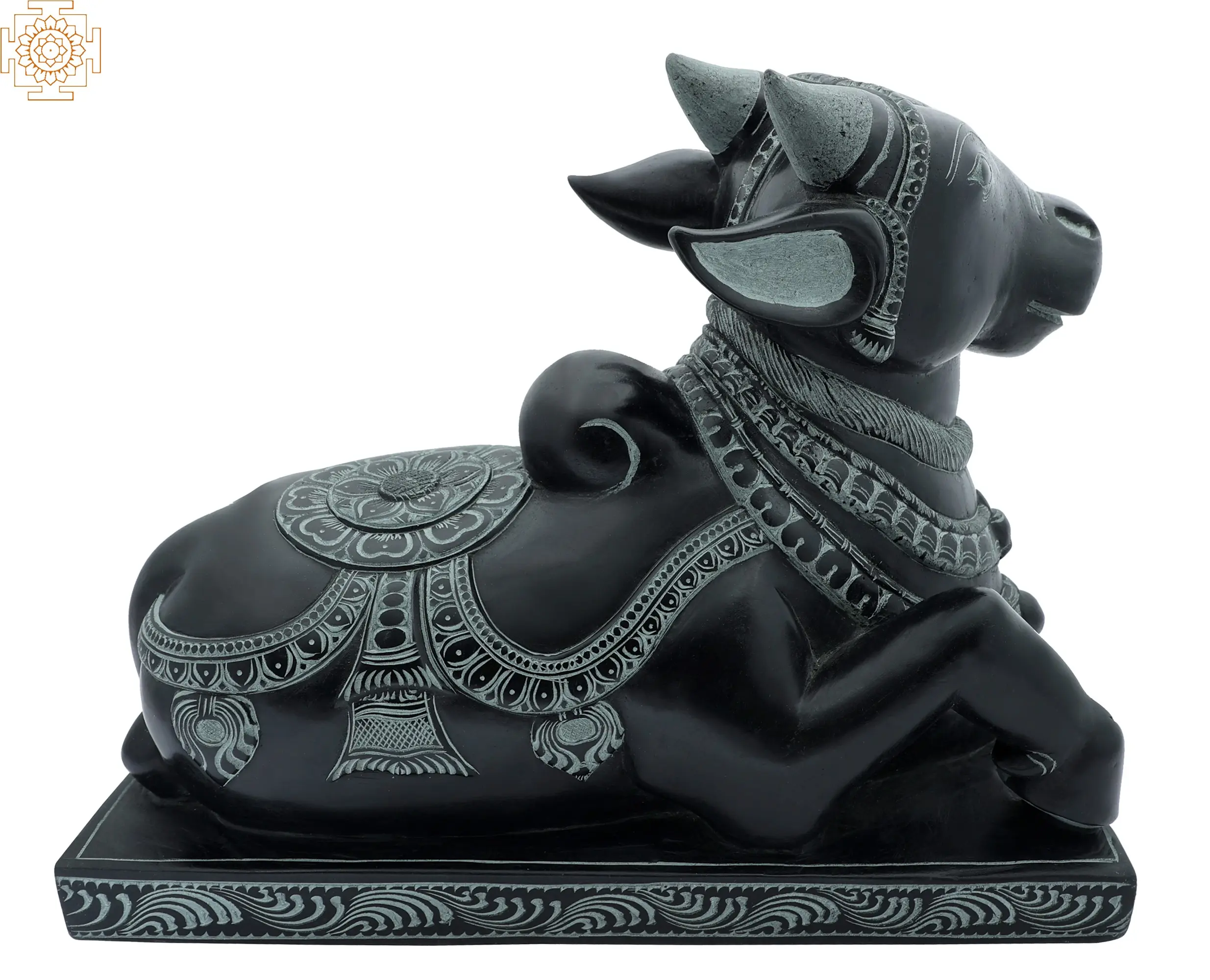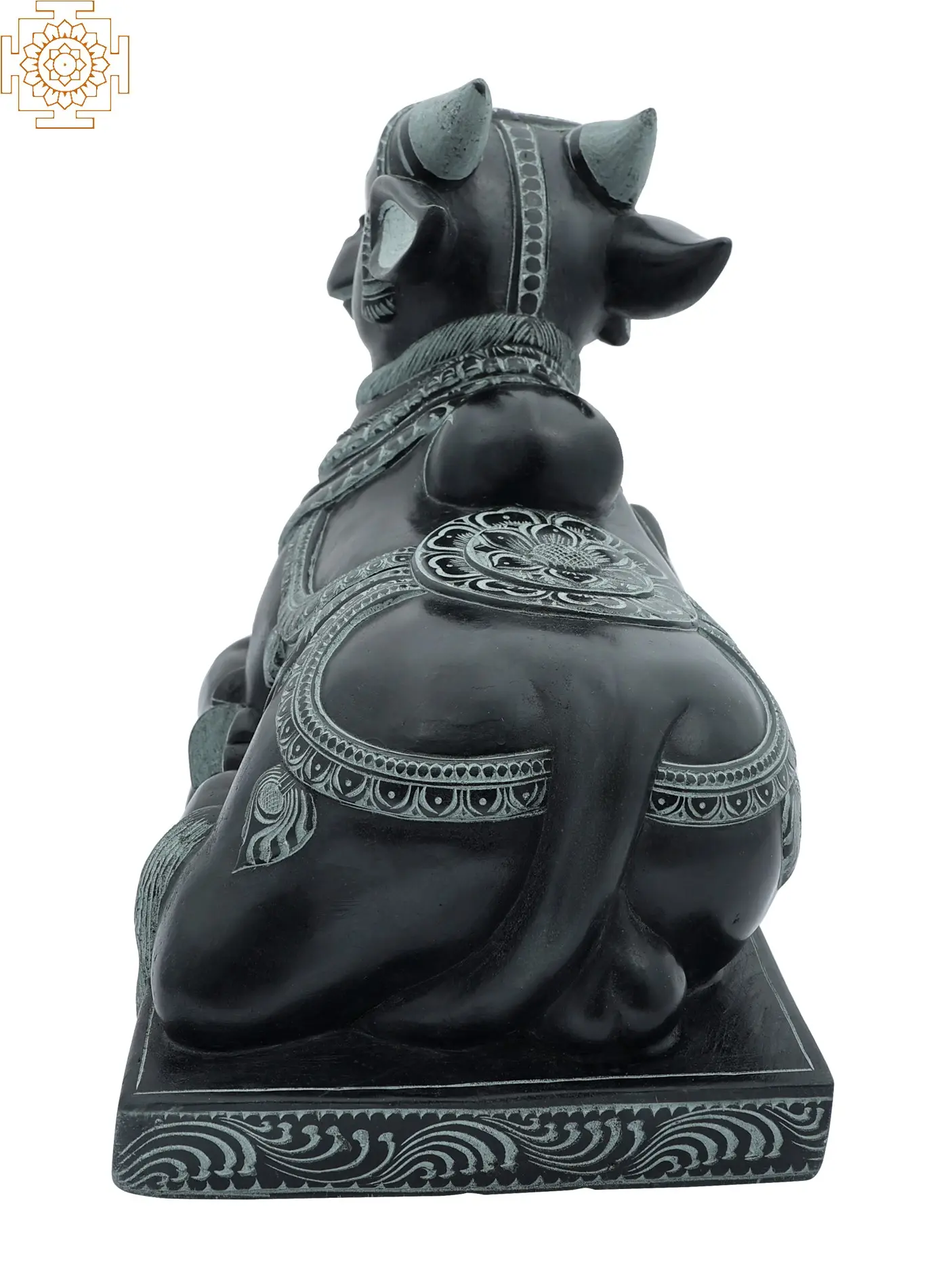 This exquisite stone sculpture captures the divine essence of Nandi, the sacred bull and devoted vahana (vehicle) of Lord Shiva. Rendered in dark, resonant stone, this artwork embodies the strength, loyalty, and profound spiritual connection that Nandi represents in Hindu tradition. Each detail, from the gentle curve of his powerful horns to the serene expression on his face, speaks of a creature of immense dignity and unwavering faith. The sculptor has meticulously adorned Nandi with traditional ornamentation, including intricate necklaces and decorative coverings, carved with a contrasting lighter tone that highlights their delicate patterns. These embellishments are not mere decoration; they signify Nandi's elevated status as a celestial being, constantly in attendance to the Supreme Being. The texture of the stone itself adds a tactile dimension, inviting contemplation and reverence. This piece originates from South India, a region renowned for its rich sculptural heritage, specifically from Mahabalipuram, a UNESCO World Heritage site famed for its ancient rock-cut temples and monolithic sculptures. The craftsmanship reflects the artistic mastery honed over centuries in this sacred locale.
