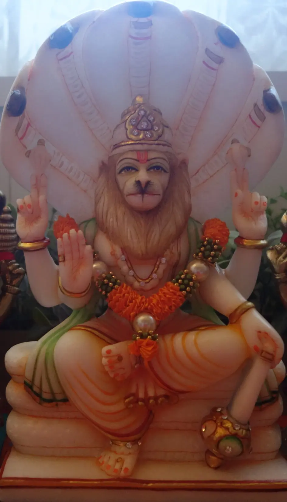 Invite the powerful presence of Lord Vishnu's fourth avatar into your sacred space with this exquisitely crafted white marble statue. Narasimha, the man-lion, is a potent symbol of divine intervention, arising to protect the innocent and vanquish the wicked. This magnificent depiction captures the fierce yet compassionate essence of this beloved deity, making it a truly inspiring addition to any altar, home, or temple. Crafted from luminous white marble, the statue emanates an aura of purity and strength. The intricate detailing showcases the divine musculature, the majestic mane, and the piercing gaze that signifies unwavering vigilance. Adorned with delicate golden accents and subtle painted details, the deity's divine ornaments, including necklaces and armbands, glint with a divine shimmer. The serene yet formidable posture, seated with a captivating composure, belies the immense power contained within. The multi-headed serpent canopy, or *hood*, crowning Narasimha is a visual testament to his cosmic dominion and his ability to overcome all obstacles, even those that are mythical and terrifying. Each serpent head, with its discerning eyes, appears to watch over the devotee with protective intent. ––––––––––––––––––