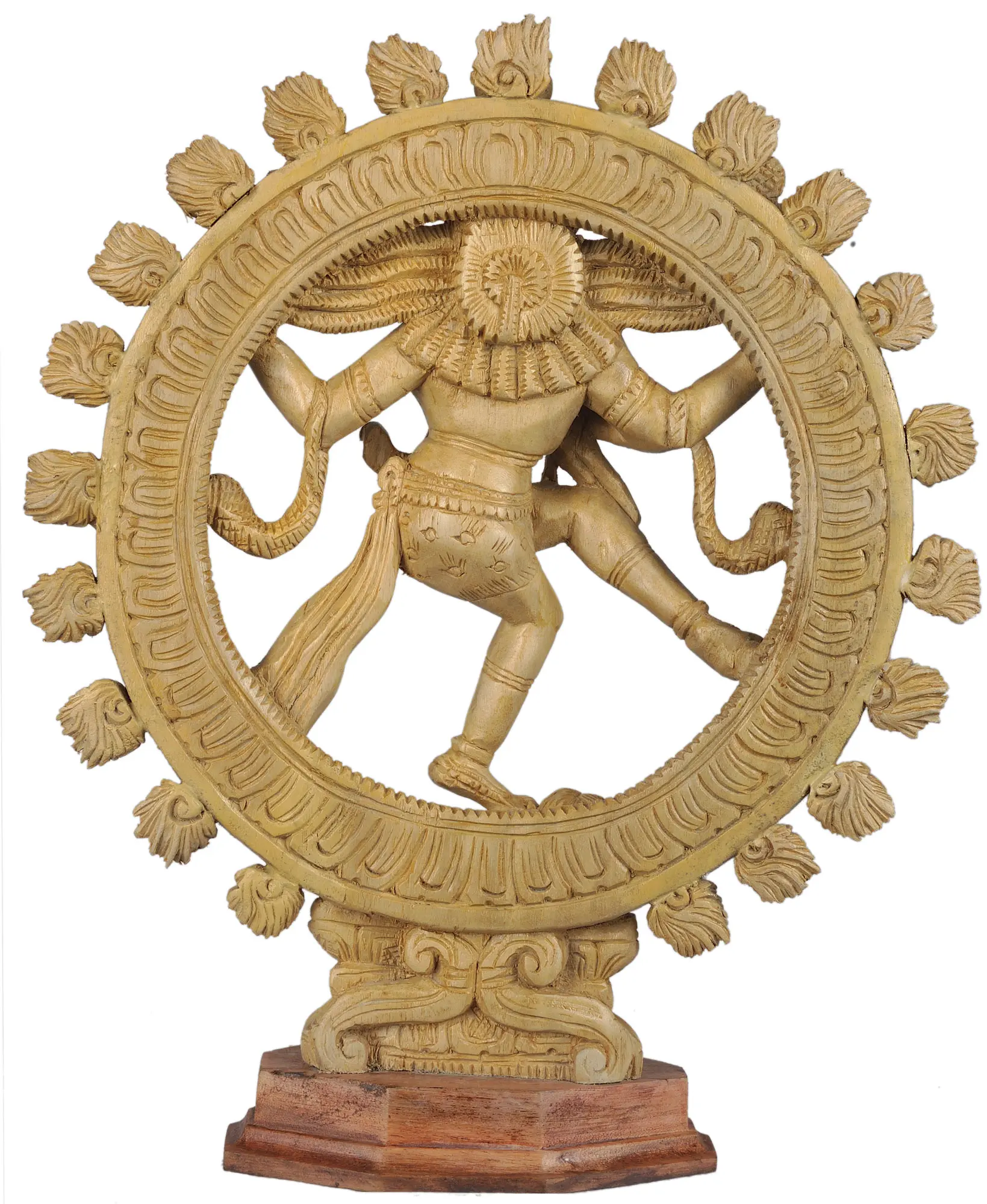 This exquisite wood carving captures the dynamic and profound symbolism of a revered depiction of Shiva, one of the principal deities of Hinduism. Shiva’s representation embodies the cyclical nature of creation, preservation, and destruction, forces that are constantly interacting and essential for the universe's vitality. This meticulously crafted statue, originating from the artisan workshops of Trivandrum, is a testament to the region's rich artistic heritage. The carving showcases the divine cosmic dancer within a flaming halo, a visual representation of the ceaseless flow of energy and the eternal dance of existence. Shiva’s right hand is raised in the "abhaya mudra," a gesture of reassurance and protection, dispelling fear and offering blessings to devotees. The other right hand holds a damaru, a small drum whose rhythm symbolizes the pulse of the universe and the sound of creation itself.