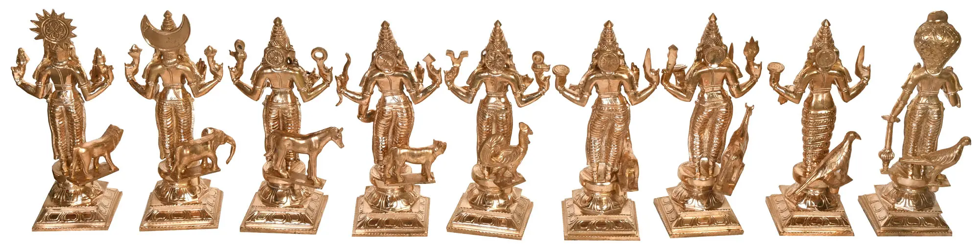 Navgrah (Sanskrit for 'nine celestial bodies') is the collection of deities in Whom are manifested the divinity contained within each celestial body of the solar system. Sooryan, Chandran, Mangal, Budhan, Guru, Shukran, Shanee, Raahoo, and Ketoo. Bronze has a more artistic, elite whiff to it. The members of the Chola dynasty constituted the key patron group of bronze sculpture, who demanded great skill in this art form, funded innovative methods that have gone down in history, and caused the golden age of bronze casting to flourish in the subcontinent.