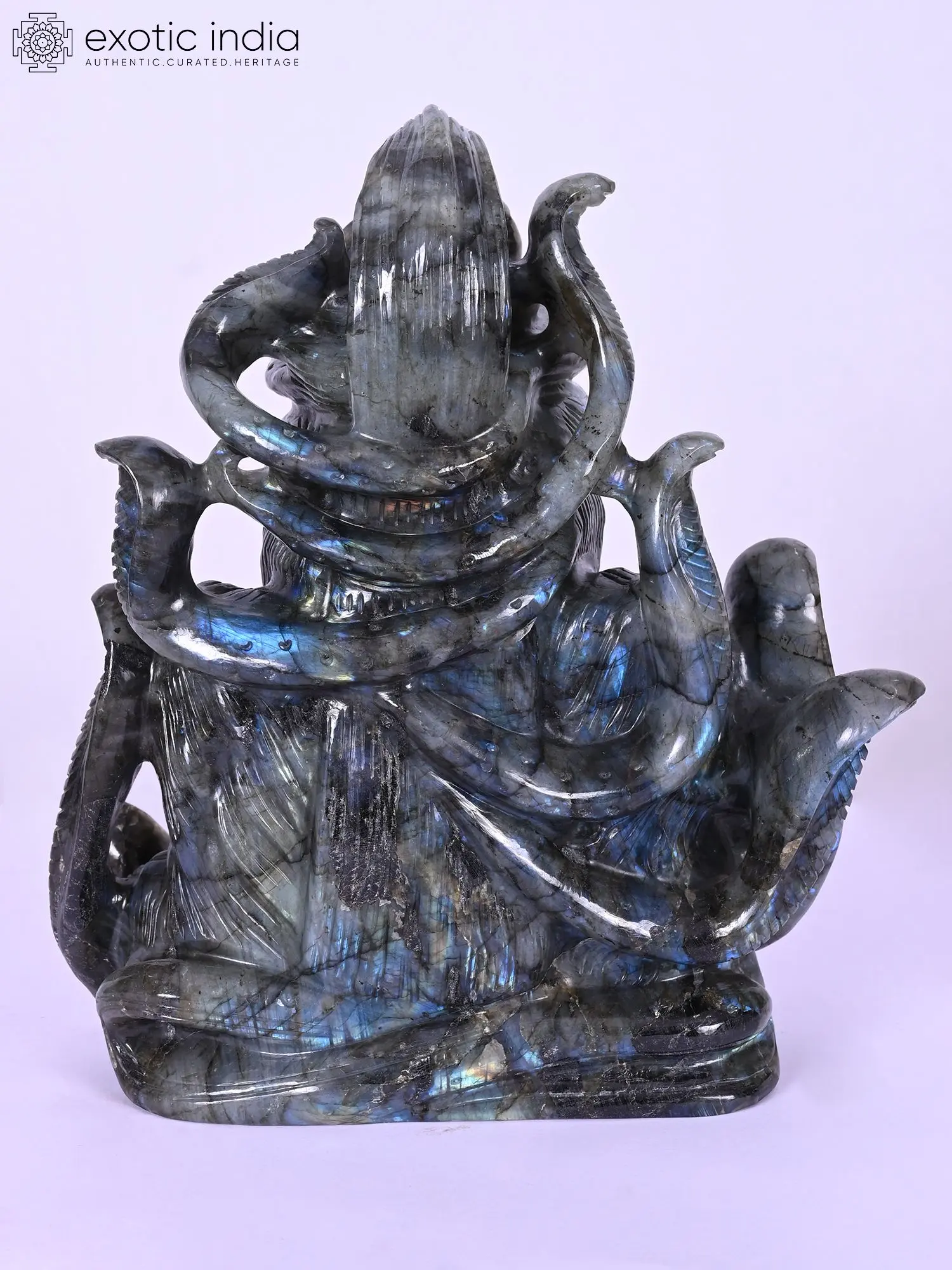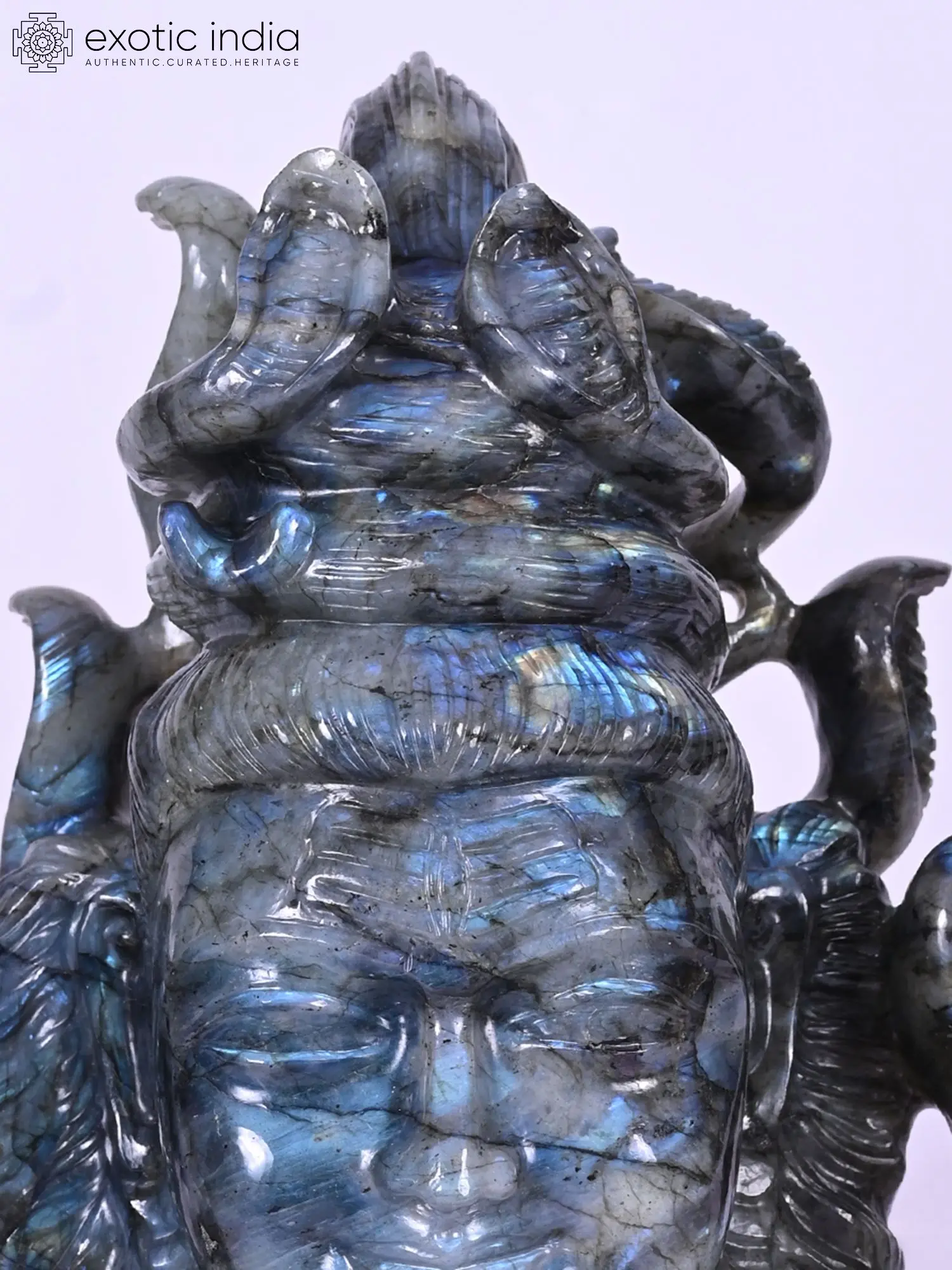 Crafted from striking labradorite, showcasing its natural iridescent blue and grey hues.