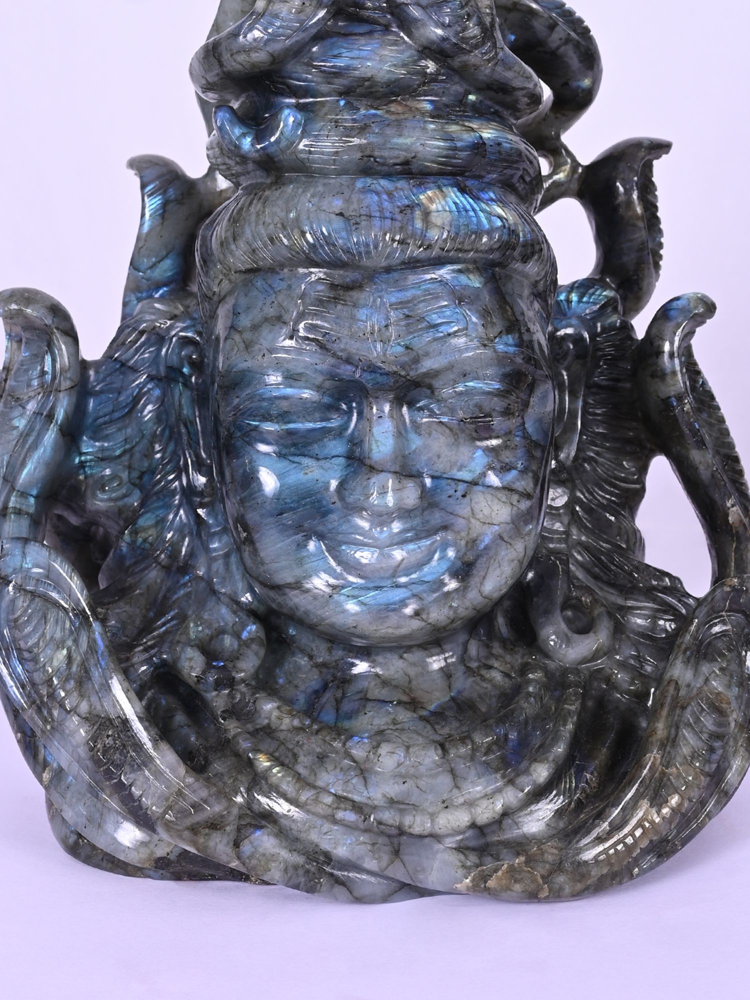 Intricate carvings highlight the detailed representation of Shiva's iconic third eye and braided hair.