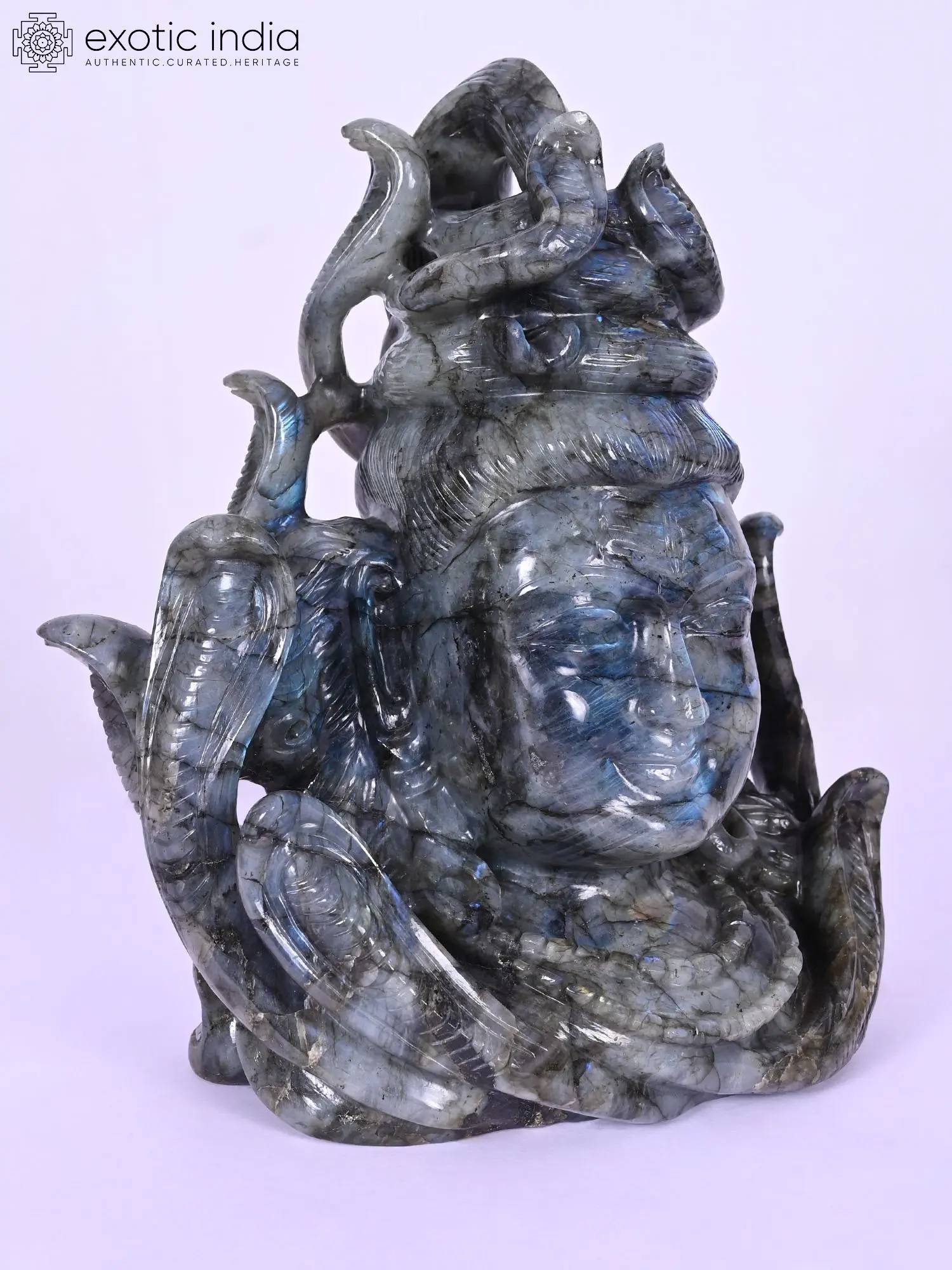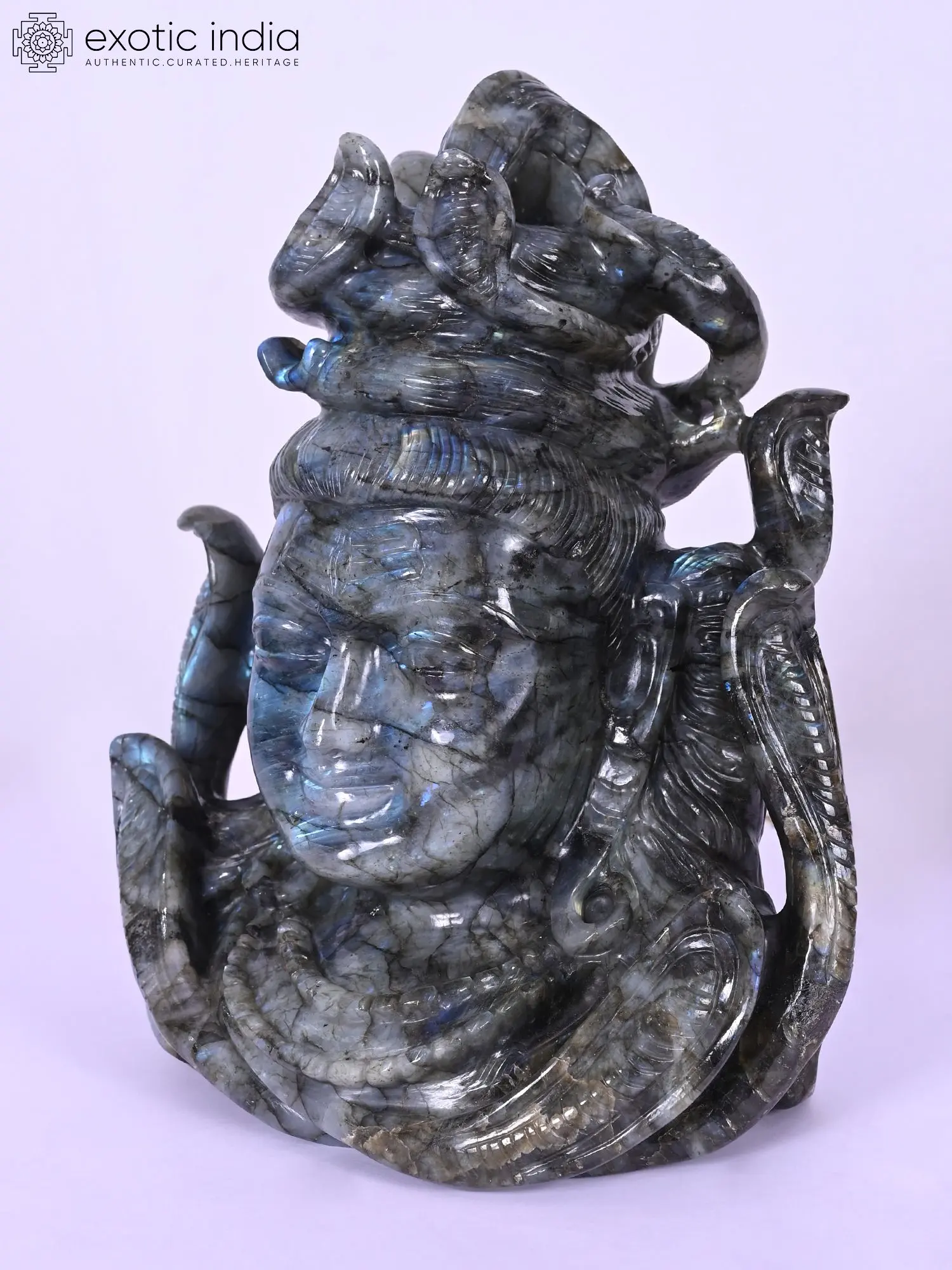The bust includes symbolic serpents adorning Shiva's crown, representing control over fear and negativity.