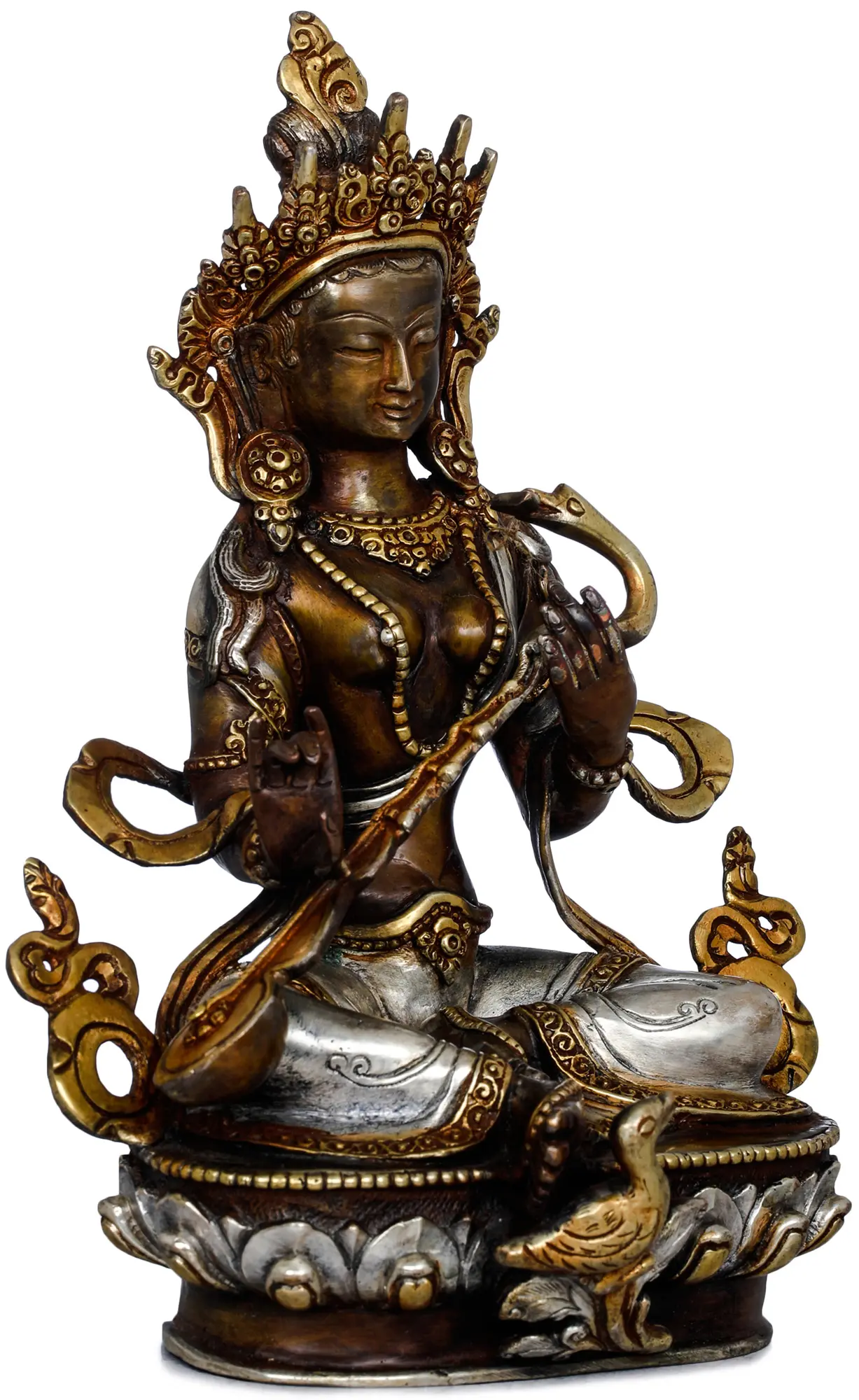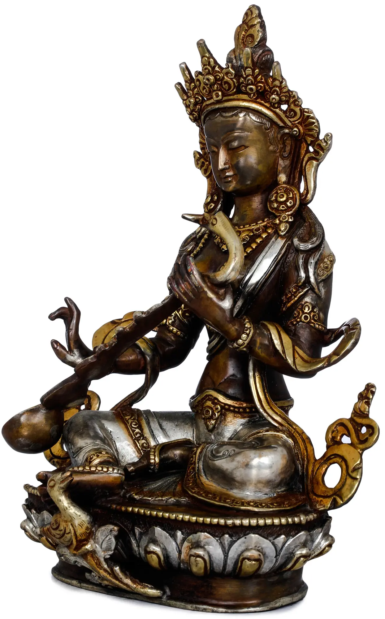 Crafted from high-quality copper, this statue showcases the exceptional artistry for which Nepalese artisans are renowned. The interplay of metallic finishes highlights the subtle nuances of her divine form, from the delicate folds of her garments to the ornate headdress that crowns her. Each element is rendered with a level of detail that speaks to a deep understanding of the iconography and spiritual significance of Saraswati. Whether you are a devotee seeking spiritual connection or an admirer of fine art, this statue serves as a powerful emblem of enlightenment, creativity, and the pursuit of knowledge. Its presence can imbue your home or meditation space with an aura of peace, inspiration, and profound understanding.