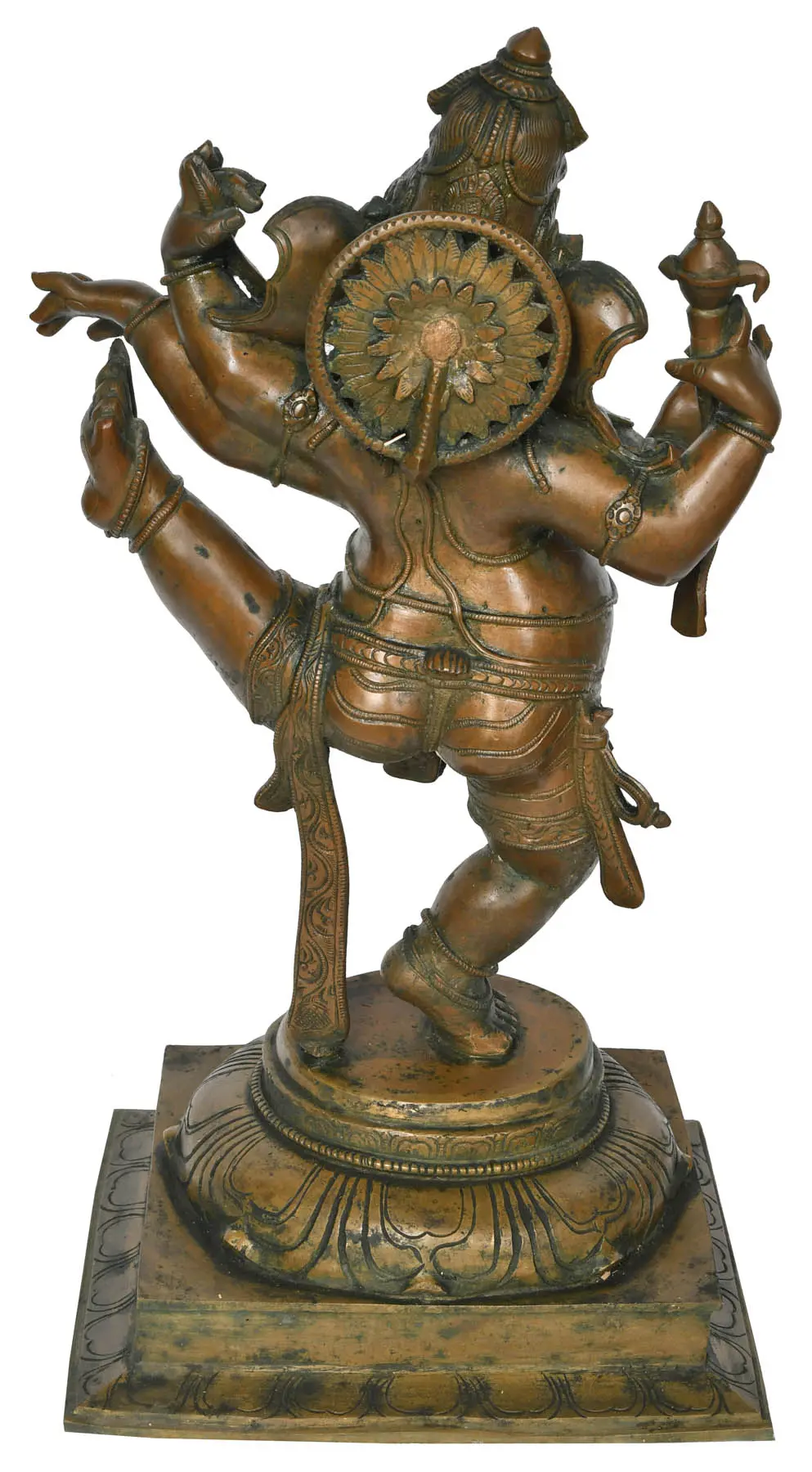 This magnificent bronze sculpture captures the divine energy and joy of Lord Ganesha in his ecstatic dancing form, known as Nritya Ganesha. Originating from the renowned workshops of Swamimalai, a place steeped in the ancient art of South Indian bronze casting, this statue embodies centuries of tradition and masterful craftsmanship. The artist has imbued the metal with life, portraying Ganesha in a dynamic pose that speaks of rhythm, celebration, and the cosmic dance of creation.