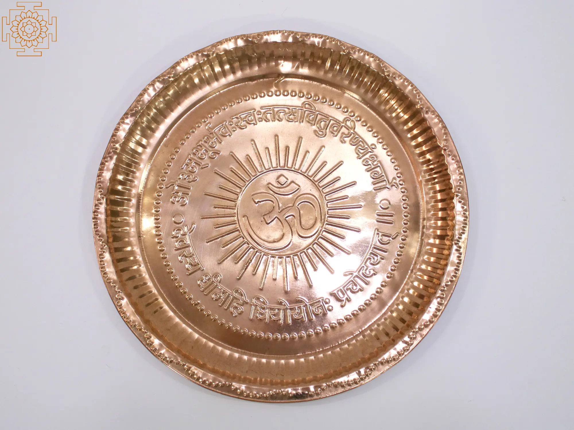 Om is the core of everything sacred in Hindu thinking. It is recited before meditation, prayer, and yoga practice and throughout the day. It exists in the past, present, and future and extends beyond time limits. This Puja Thali, made in copper, is rich with Om symbolism and is one of the most inventive approaches to a practical item. The ancient Gayatri Mantra repousse encircles a Puja Thali with an Om sign. The thali's rim is finely carved with single lines to depict a halo. This Puja Thali is a dignified serving item for religious rituals and worship, with intricate designs and symbolic motifs.