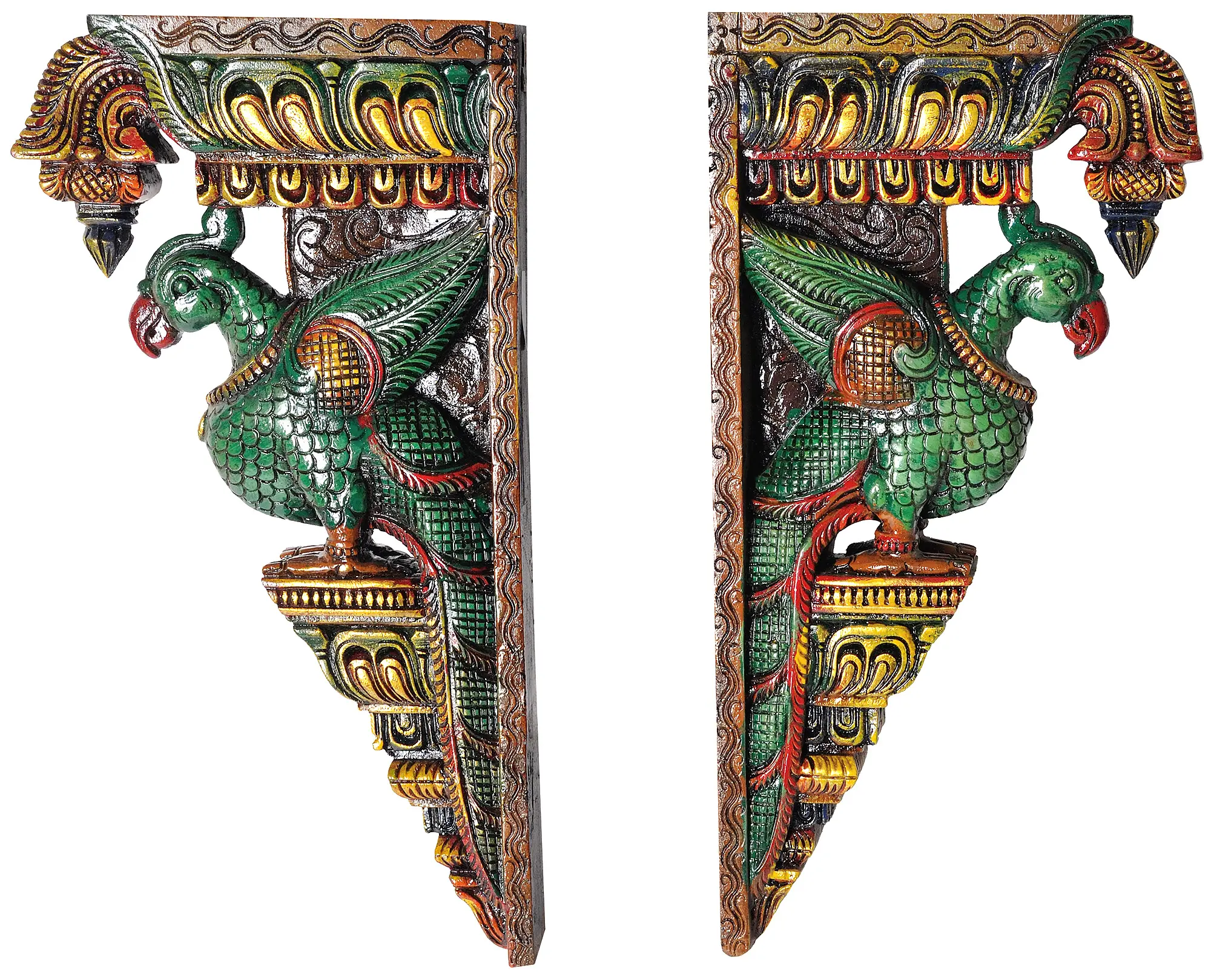 The detailed craftsmanship extends to the supporting structure of the brackets, which are richly decorated with a vibrant palette of colors, including deep yellows, fiery reds, and striking blues. These colors are not merely aesthetic choices; they often carry symbolic meanings in Hindu art. Yellow, for instance, is associated with knowledge, learning, and prosperity, while red signifies purity, fertility, and courage. The layered, architectural detailing at the top of each bracket further enhances their ornate character, reminiscent of the elaborately carved beams and lintels found in ancient South Indian temples. These brackets would have traditionally been used to support wooden beams, cornices, or platforms in temples, providing both structural integrity and immense aesthetic appeal. They served to elevate the sacred space, drawing the eye upwards and encouraging devotion. Even outside of a temple context, these pieces bring a touch of that sacred artistry and protective symbolism into your home. Imagine them adorning a doorway, framing a beloved artwork, or accentuating a shelf where cherished mementos are displayed. Their presence adds a layer of history, spirituality, and undeniable beauty. As South Indian temple wood carvings, these brackets carry the essence of a profound artistic legacy. They are more than just objects; they are carriers of stories, protectors of spaces, and vibrant expressions of faith and culture. Bringing these Parrot Brackets into your home is an invitation to experience the enduring beauty and spiritual resonance of traditional Indian craftsmanship.