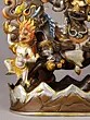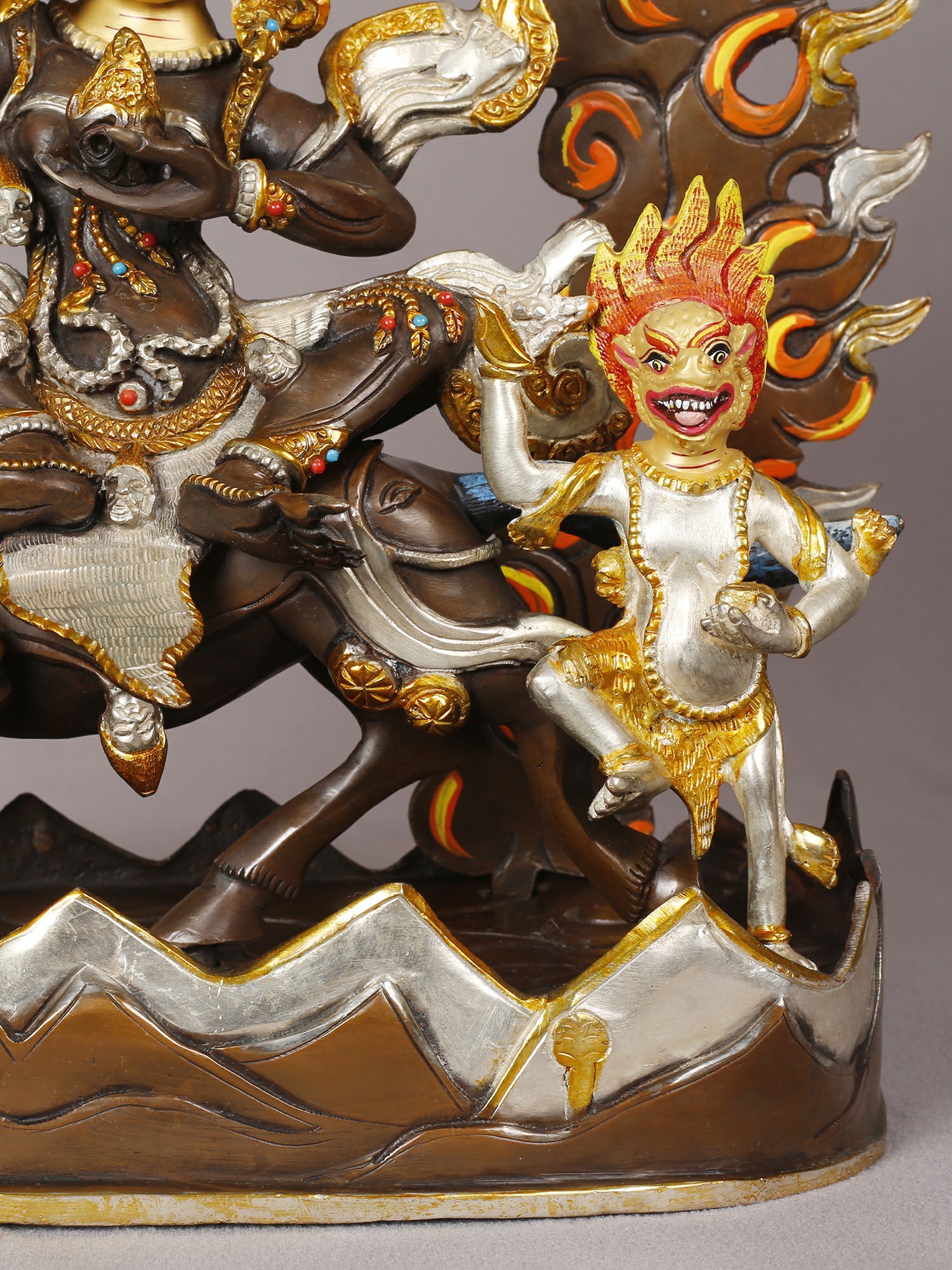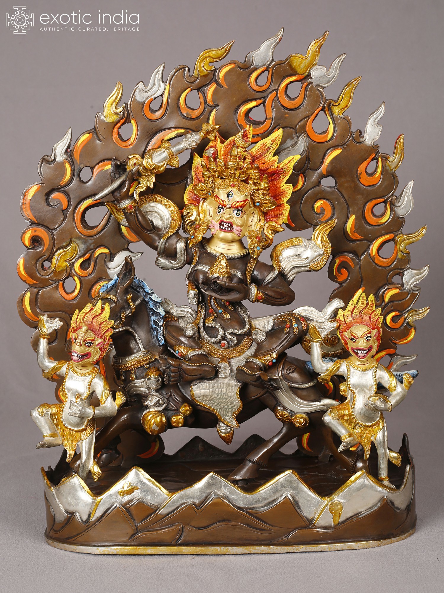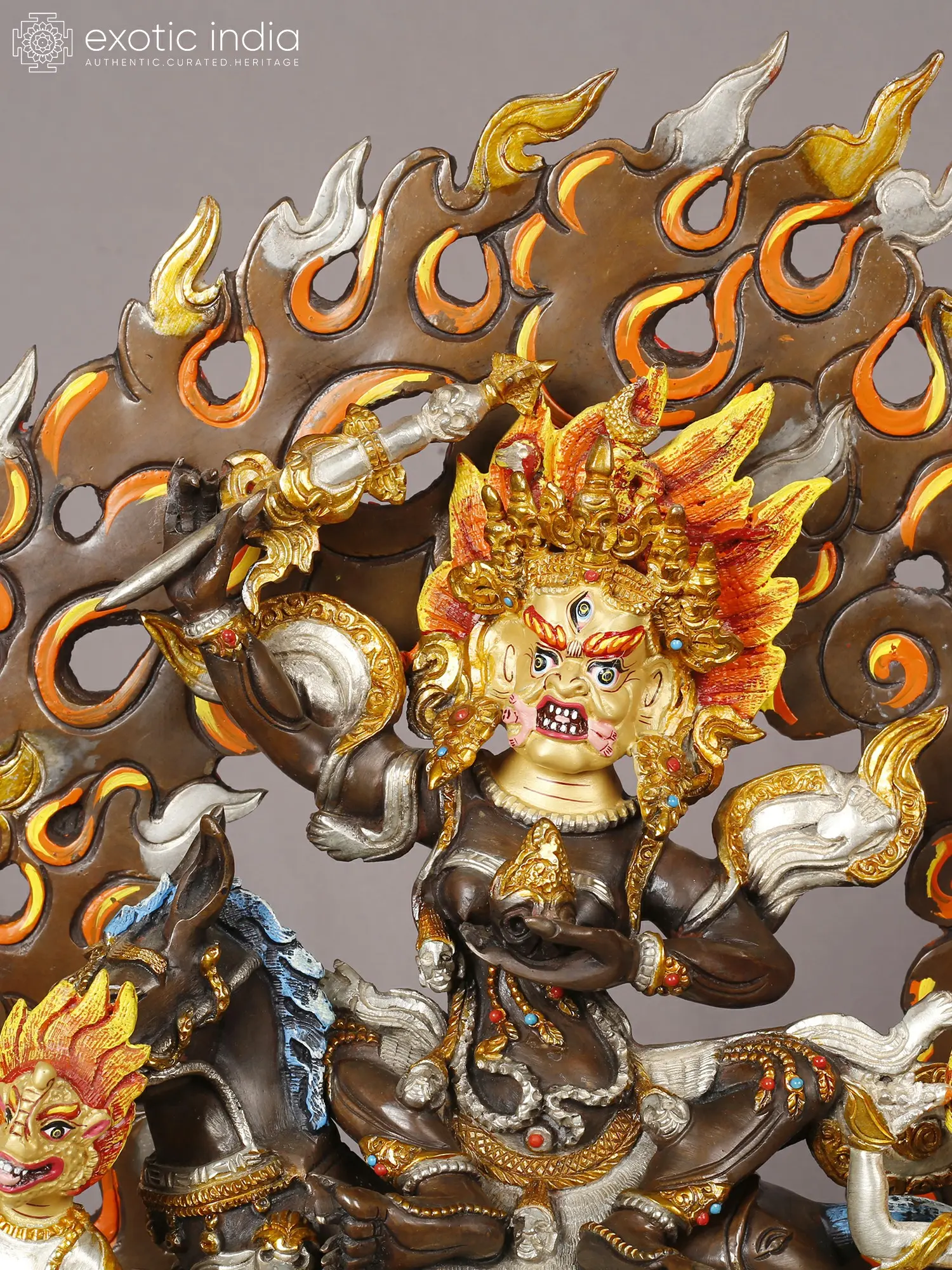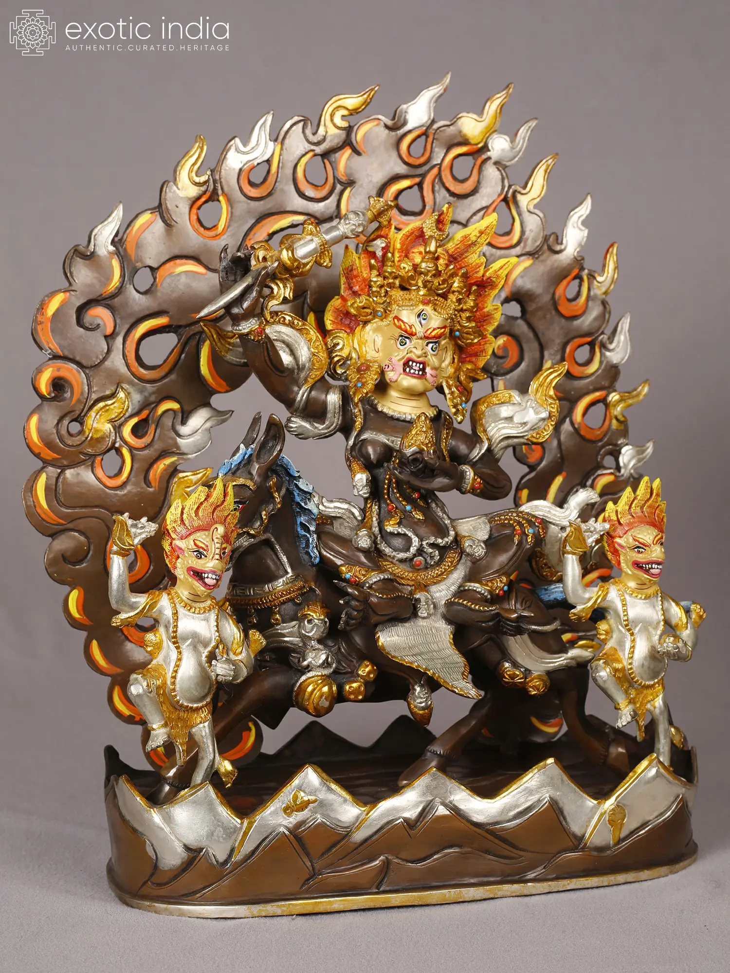 The central figure commands attention with its intense gaze and tripartite visage, framed by a magnificent halo of stylized flames. The rich copper forms the robust base, upon which the divine being is seated astride a powerful steed. Surrounding the central deity, smaller attendant figures mirror the fiery energy, their forms rendered with equal meticulousness. The interplay of gold and silver plating across the figures and their adornments creates a dazzling contrast, highlighting every sculpted detail and imbues the piece with an otherworldly luminescence.