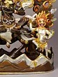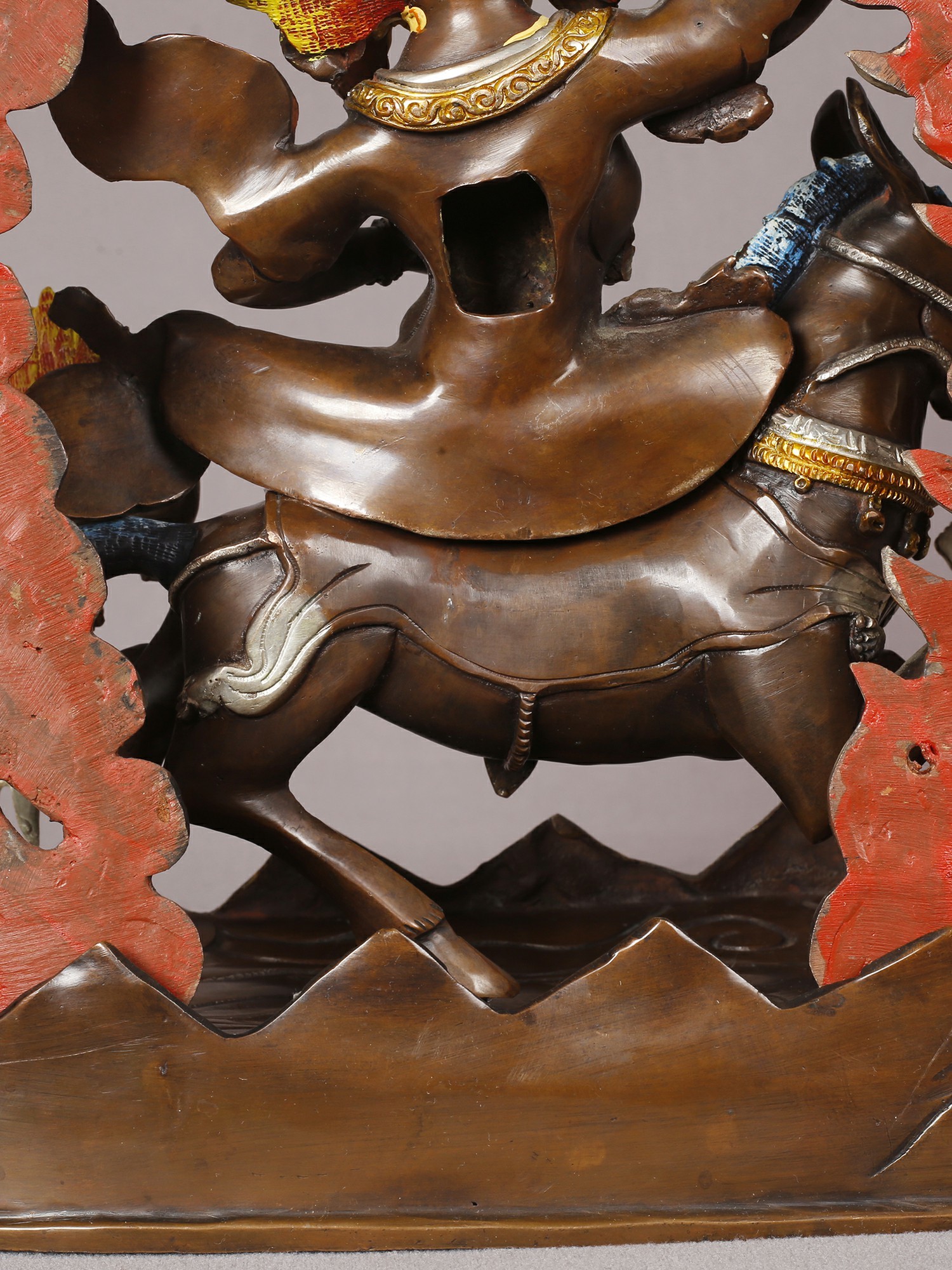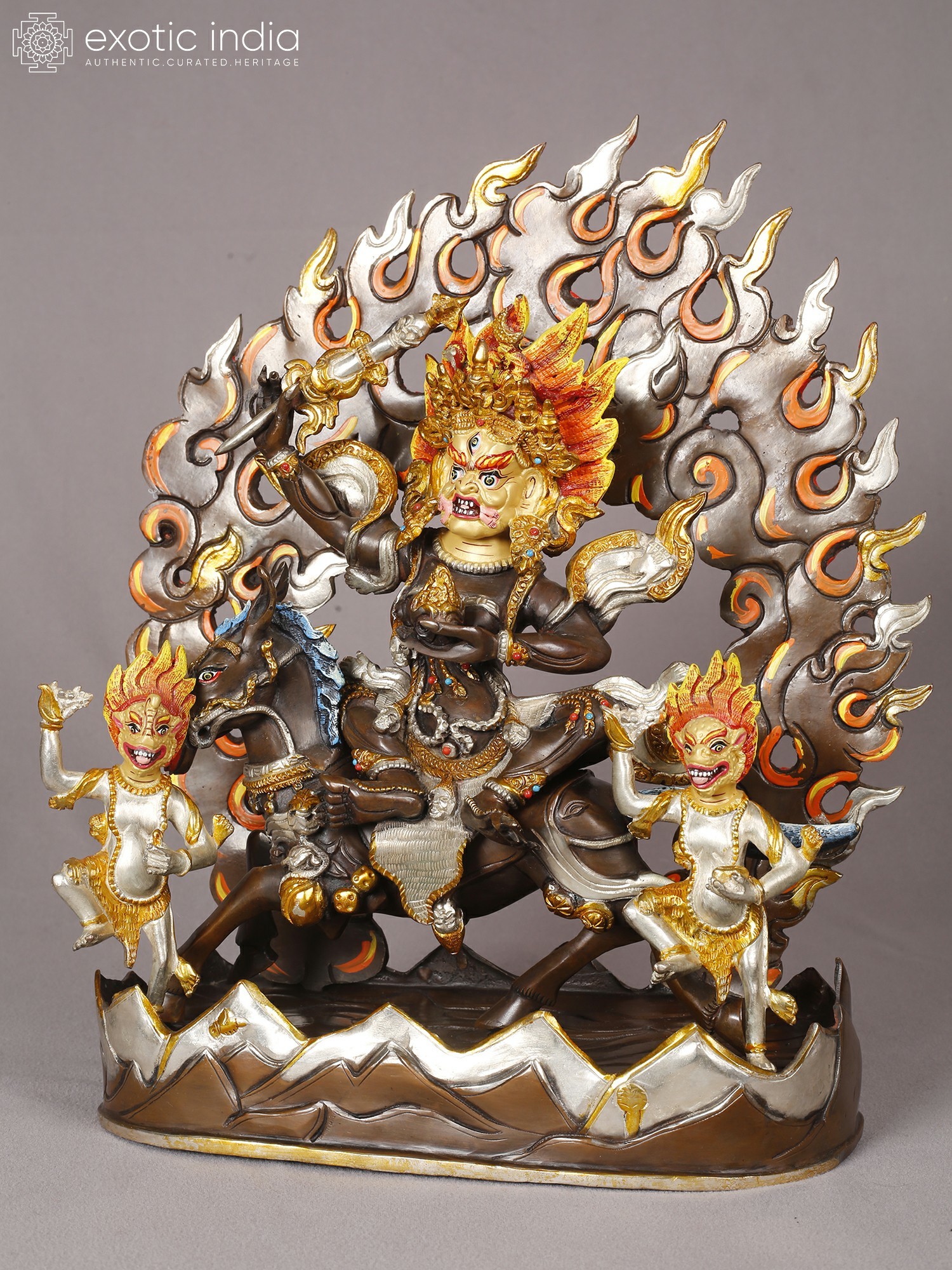Forged from the finest copper, this remarkable piece showcases the pinnacle of artisanal skill. Each element, from the fierce countenance to the dynamic posture, is meticulously shaped and refined by hand. The lavish gold and silver plating are applied with expert precision, creating a luminous finish that accentuates the depth and character of the form. You'll appreciate the substantial weight and the flawless surface, testament to the enduring quality of its construction.