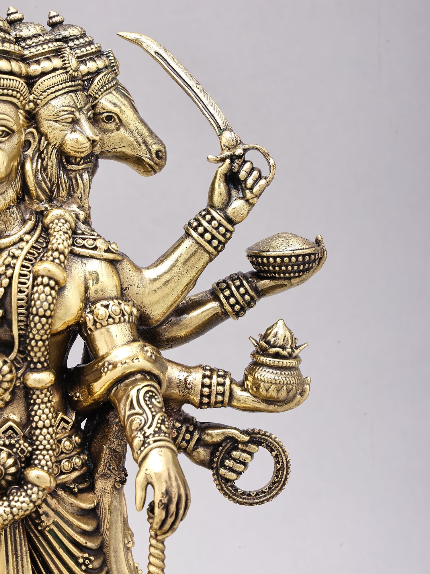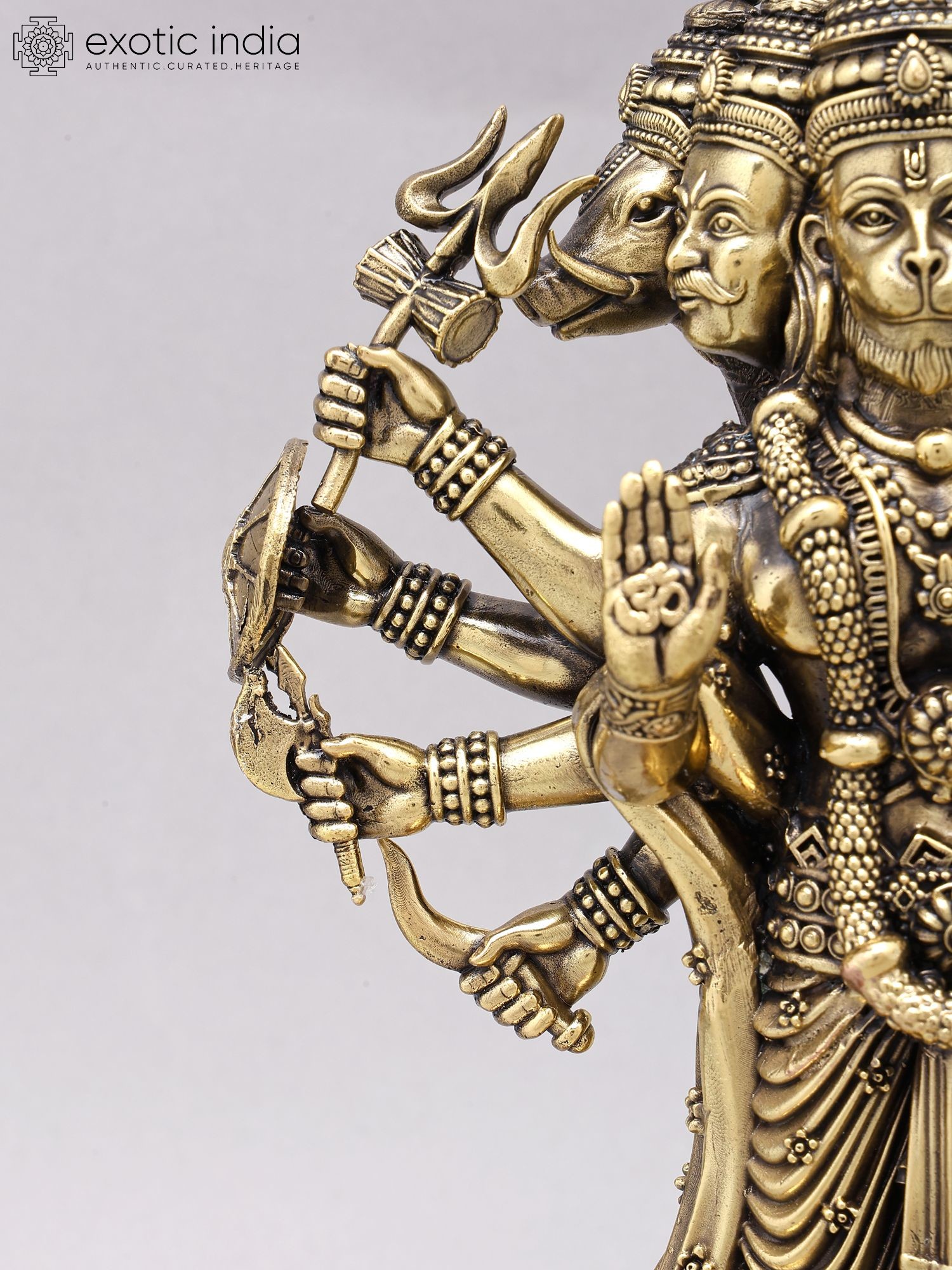 This brass sculpture depicts Panchamukhi Hanuman, a form of the deity with five faces.