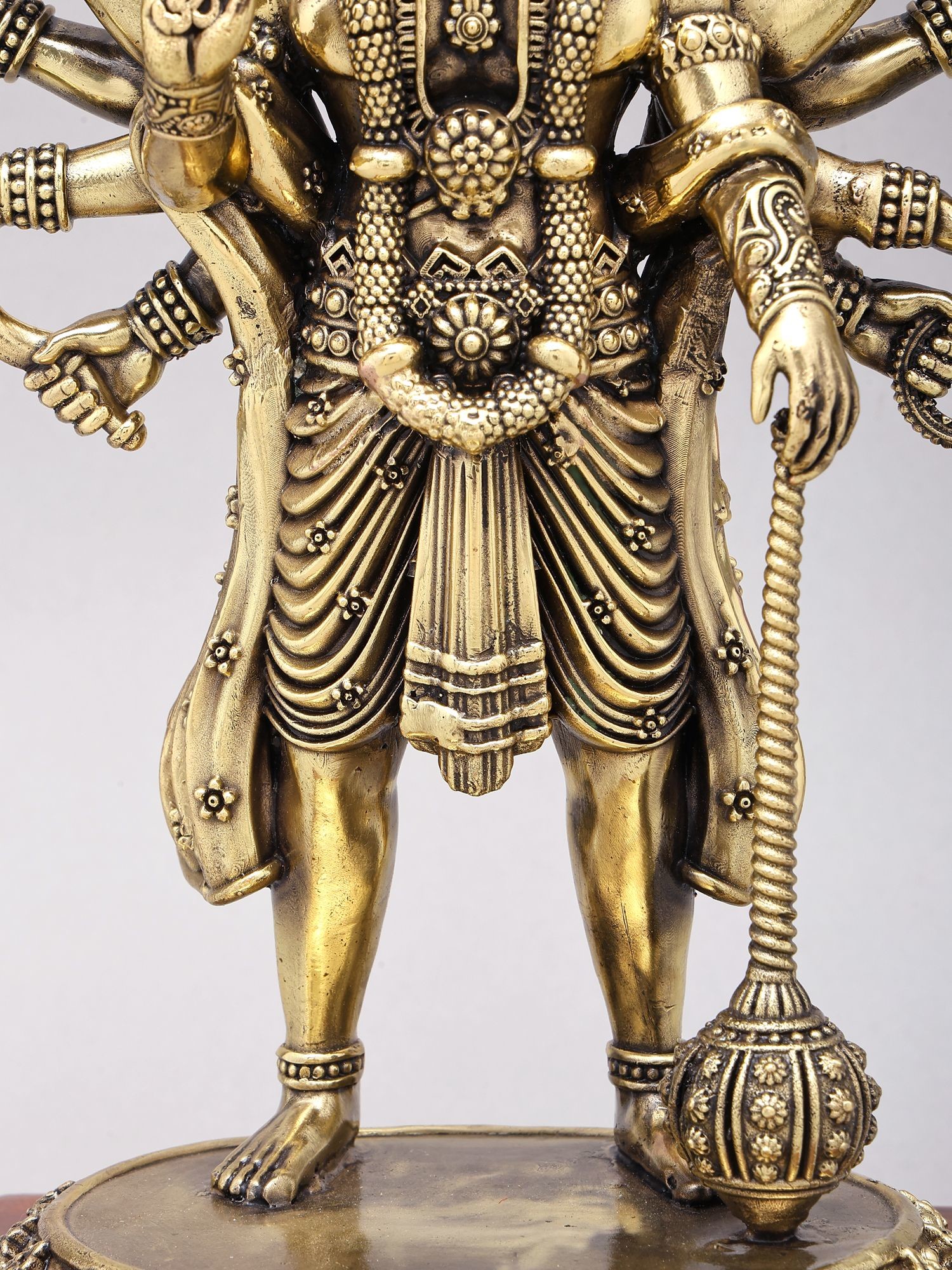 The presence of multiple hands holding various symbolic items signifies Hanuman's strength and divine attributes.