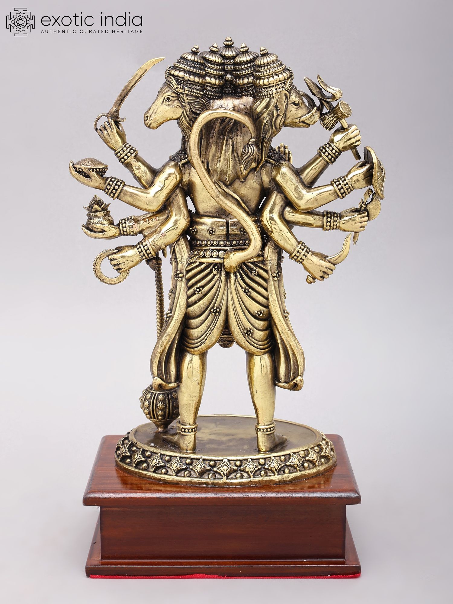 7" Superfine Ten Armed Panchamukhi Hanuman Seated on Wood Base | Brass Sculpture