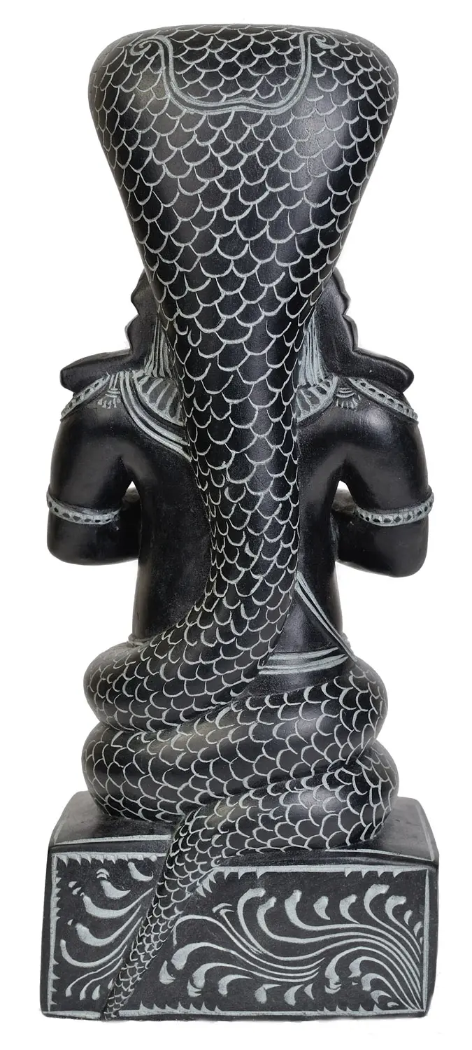 The stone used for this statue hails from the historic shore temples of Mahabalipuram, a UNESCO World Heritage site on the Coromandel Coast of Tamil Nadu, India. For centuries, artisans in this region have honed their skills in carving intricate sculptures from monolithic rock. This heritage is evident in the detailed craftsmanship of this piece. The delicate incised lines that define the scales of the serpent, the ornate patterns on the headdress and jewelry, and the serene, contemplative expression on Patanjali's face all speak to the skill and dedication of the sculptor. The contrasting tones of the carved stone, highlighting the relief work, add a dynamic visual appeal, making this statue a compelling object of devotion and art.