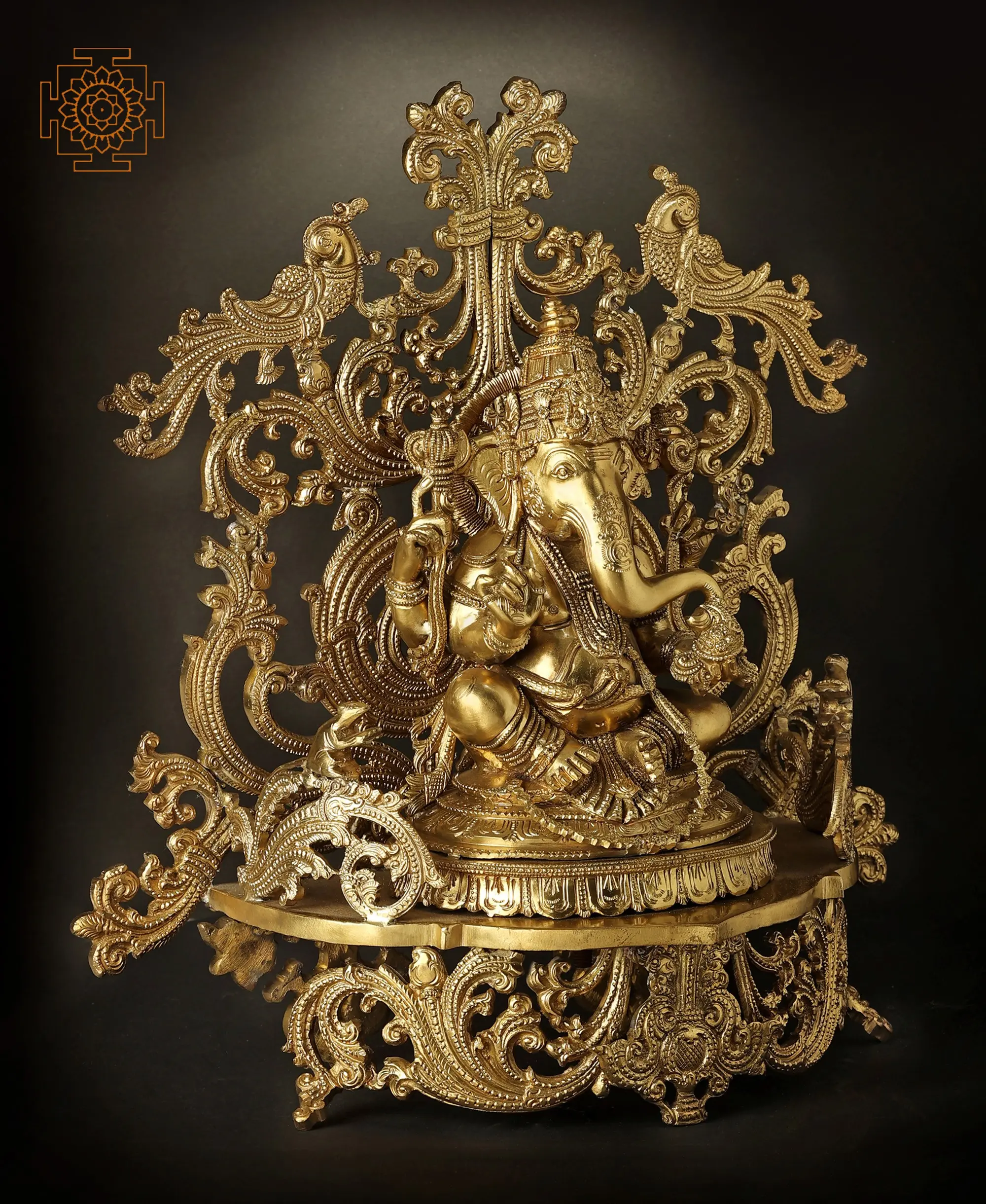 The luxuriant vine aureole adds an inimitable brilliance to this bronze composition. Indeed, the sheer proportion of vines around the murti and the style of pedestal are signature aspects of the workmanship of the South. From the throne of Lord Ganesha emerges a network of graciously curving vines in a perfectly symmetrical spread about Him. Two of His vahana, the mouse, are on either side of the throne upon those vines, while a pair of peacocks are perched on top above His crown.
