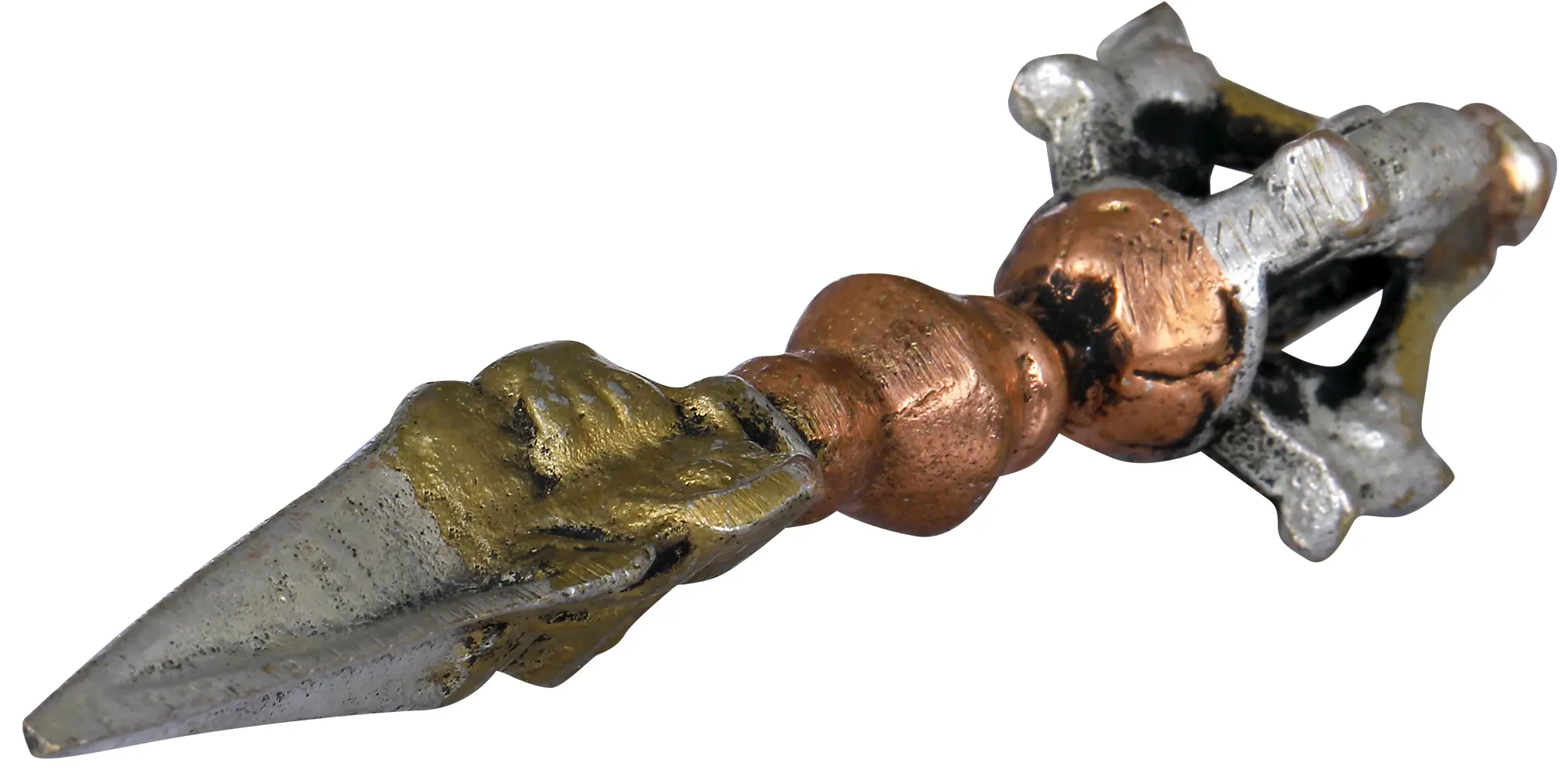 The Phurpa, which is a ritual dagger or the Vajrakilaya, is an important symbol that belongs to the Tibetan Buddhists. It is a triangular-shaped dagger with sophisticated ornamental patterns, with a prominent “Five-Pronged Dorje” or “Five-Pointed Vajra” at the top. Five Vajra symbols of overcoming obstacles. Phurpa is an essential instrument in Tibetan rituals, especially in the context of exorcism, expelling evil, and suppression of a demon or adversaries. It purifies and transforms negative energy into positive one. The conjunction of the Phurpa and the Five-Pronged Dorje symbolizes the practitioner’s ability to overcome inner and outer obstacles on the path and create transformation and enlightenment.