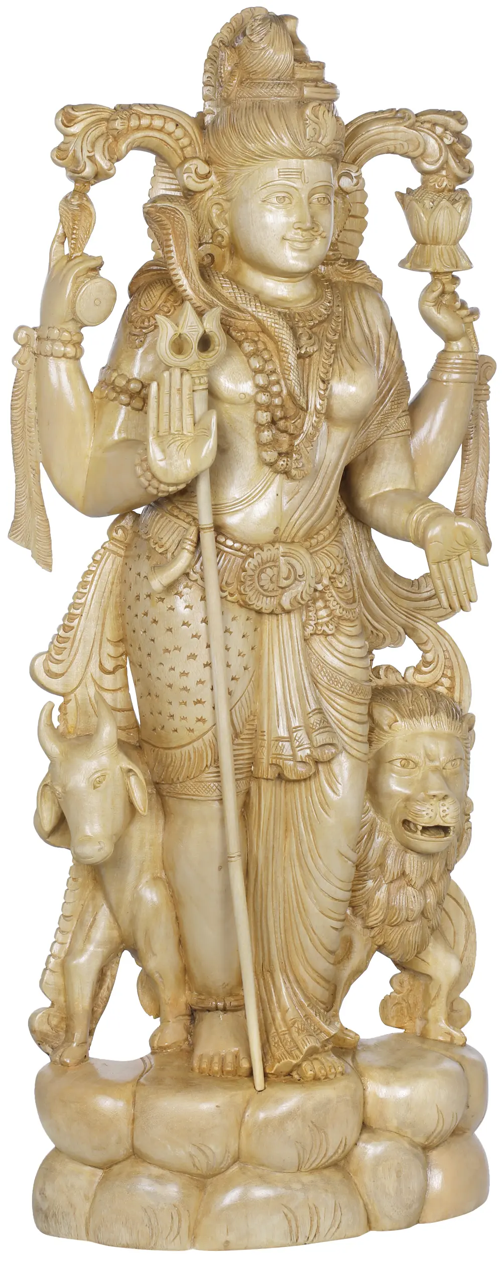 The Ardhanarishvara form itself is rich with symbolic meaning. It illustrates that the universe is a balance of male and female principles, and that creation can only occur through their union. The right half, representing Shiva, often depicted with a serpent coiled around his neck, a symbol of cosmic energy and transformation, and a trident ( Trishul ), signifying the three aspects of consciousness (creation, preservation, and destruction). The left half, embodying Parvati, is adorned with regal jewelry and graceful drapery, reflecting her divine beauty and nurturing power. The accompanying Nandi, Shiva's bull, symbolizes dharma and steadfastness, while the lion, often associated with Parvati's fierce aspect, represents strength and courage. These elements, expertly rendered in wood, create a compelling narrative of divine harmony.