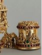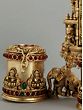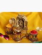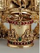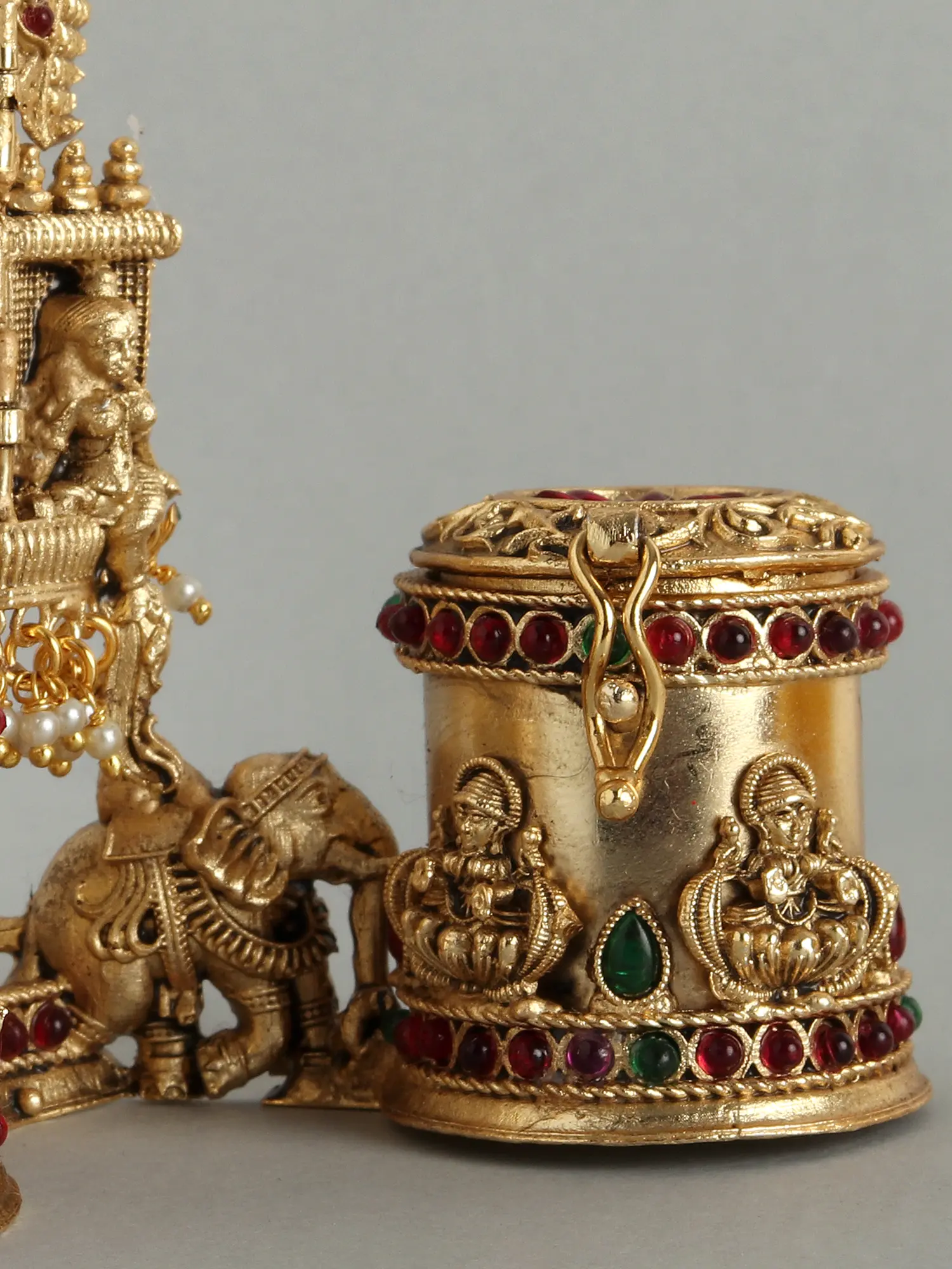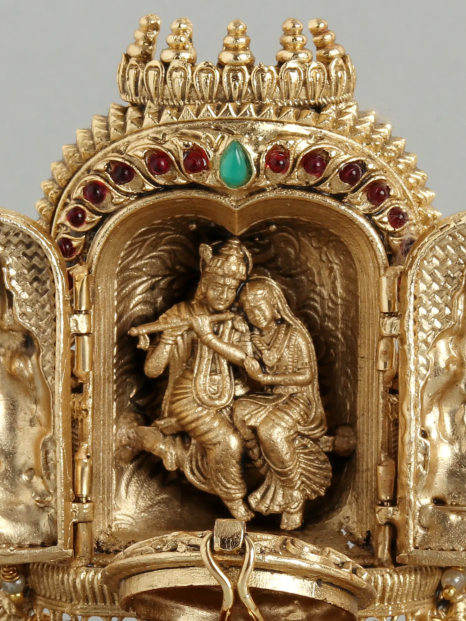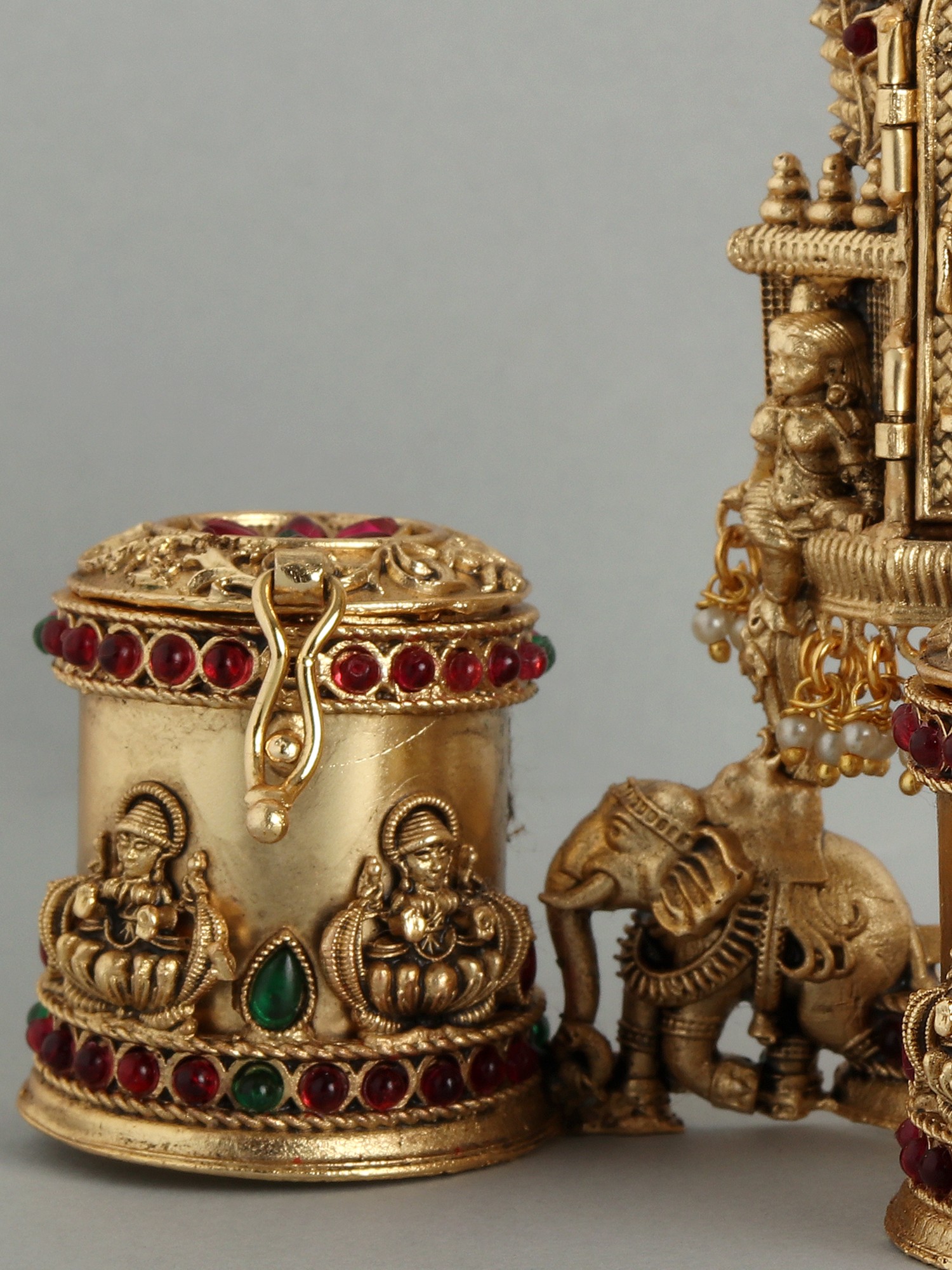 Step into the royal court of love with Radha Krishna in Royal Court Sindoor Box. Three intricately crafted boxes, each telling a tale of devotion. Radha and Krishna, entwined in eternal love, hold the throne above the Sindoor, signifying the sacred bond of marriage. Their presence in your space radiates love and devotion in the lives of their devotees. The sindoor they offer isn't just a pigment but a symbol of the unbreakable bond between two souls. Let their divine love fill your life with passion and commitment.