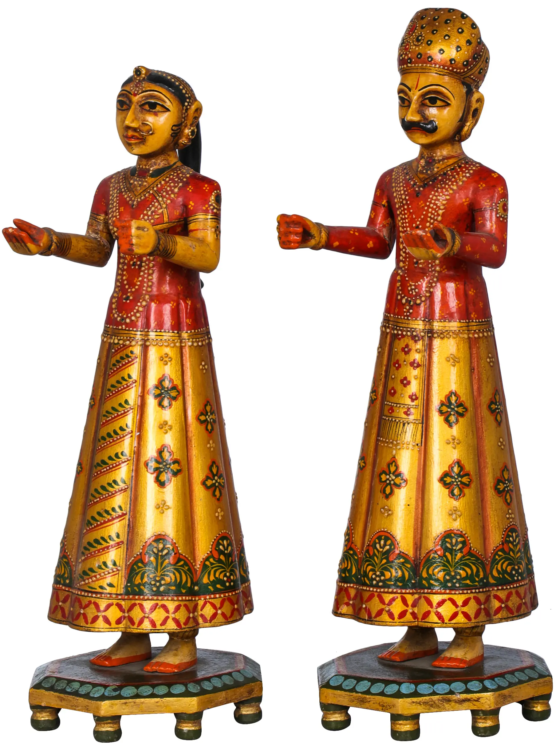 These exquisite wooden figures capture the essence of Rajasthani royalty, bringing a touch of regal splendor and rich cultural heritage into your home. Crafted with meticulous attention to detail, this pair embodies the timeless romance and grandeur associated with the legendary kings and queens of this vibrant Indian state. The statues depict a Raja and Rani, adorned in traditional attire, exuding an aura of nobility and grace. Their stylized forms, painted in vivid reds, opulent golds, and deep greens, are reminiscent of Kathputli (string puppetry) traditions, a significant folk art form of Rajasthan, where such figures come alive to narrate epic tales.