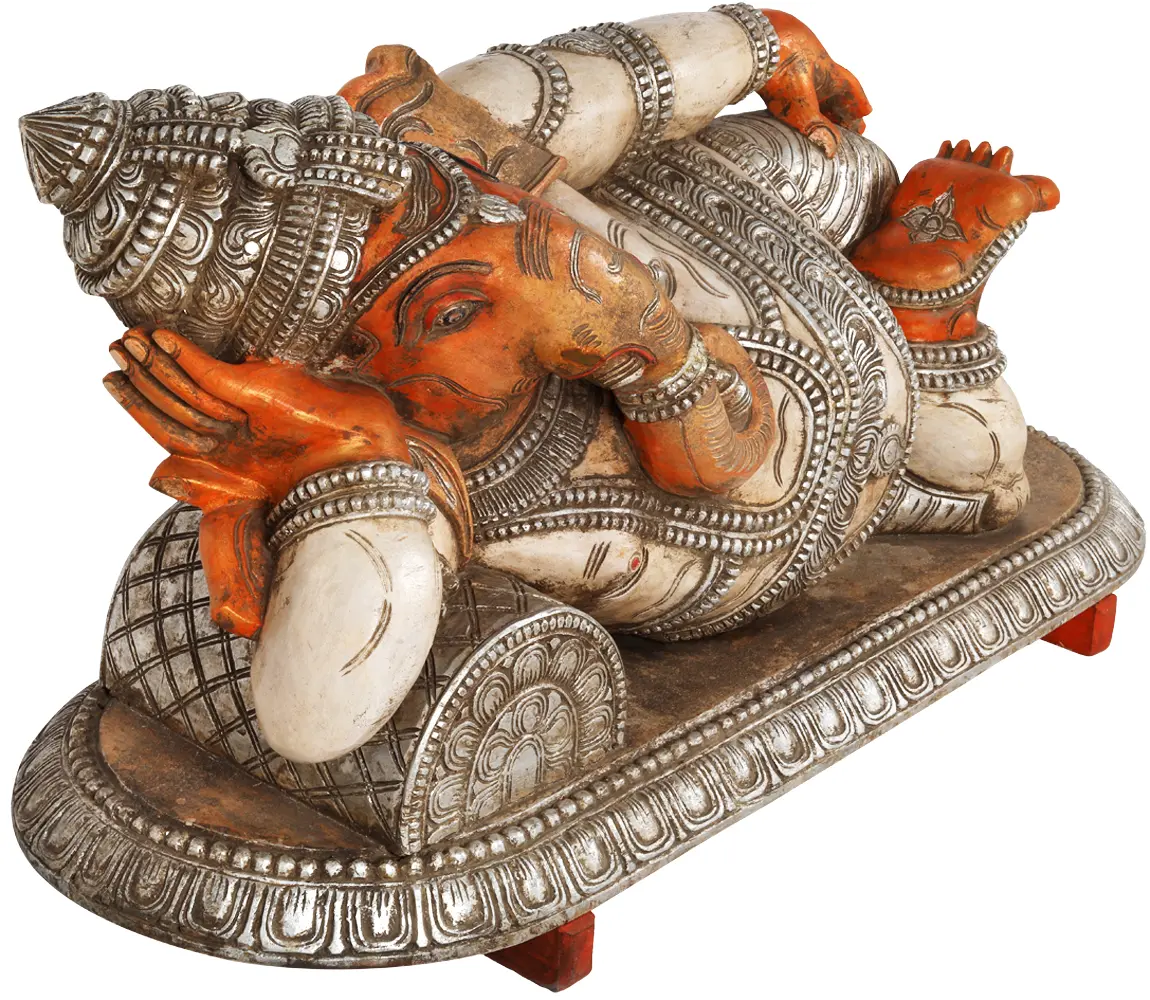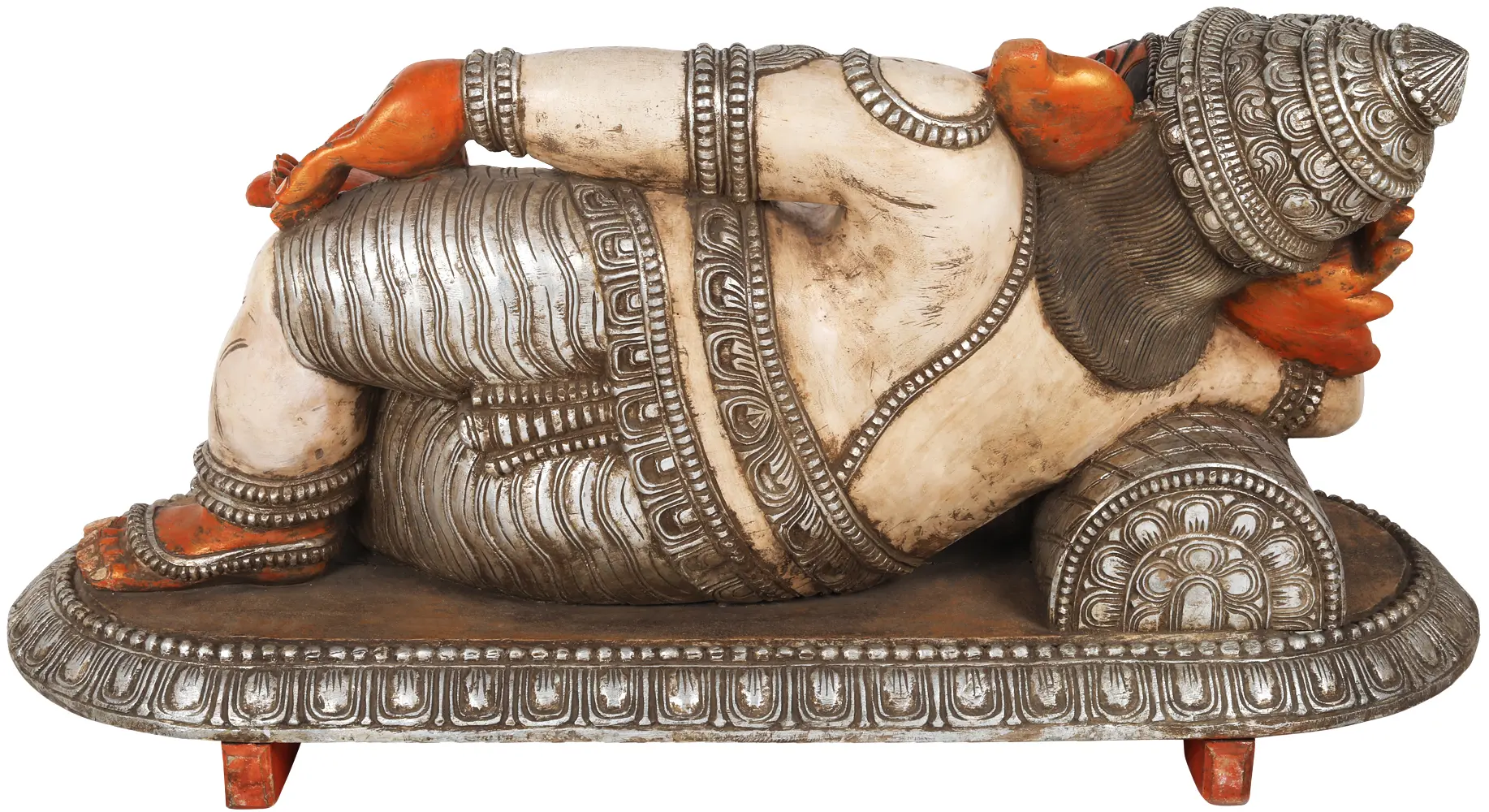 Lord Ganesha rests the head upon a hand propped up by the elbow, while a richly embroidered bolster lies under His arm. The other arm rests languidly upon the side of His body. Both legs folded at the knee for the soles to rest downwards and face upwards, respectively. The composition rests upon a flat pedestal supported by scarlet-coloured legs.
