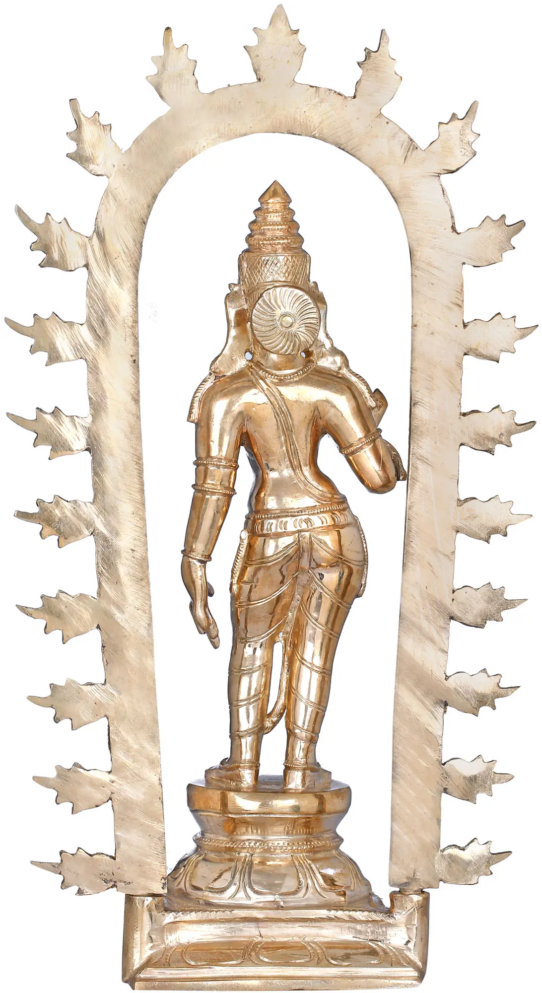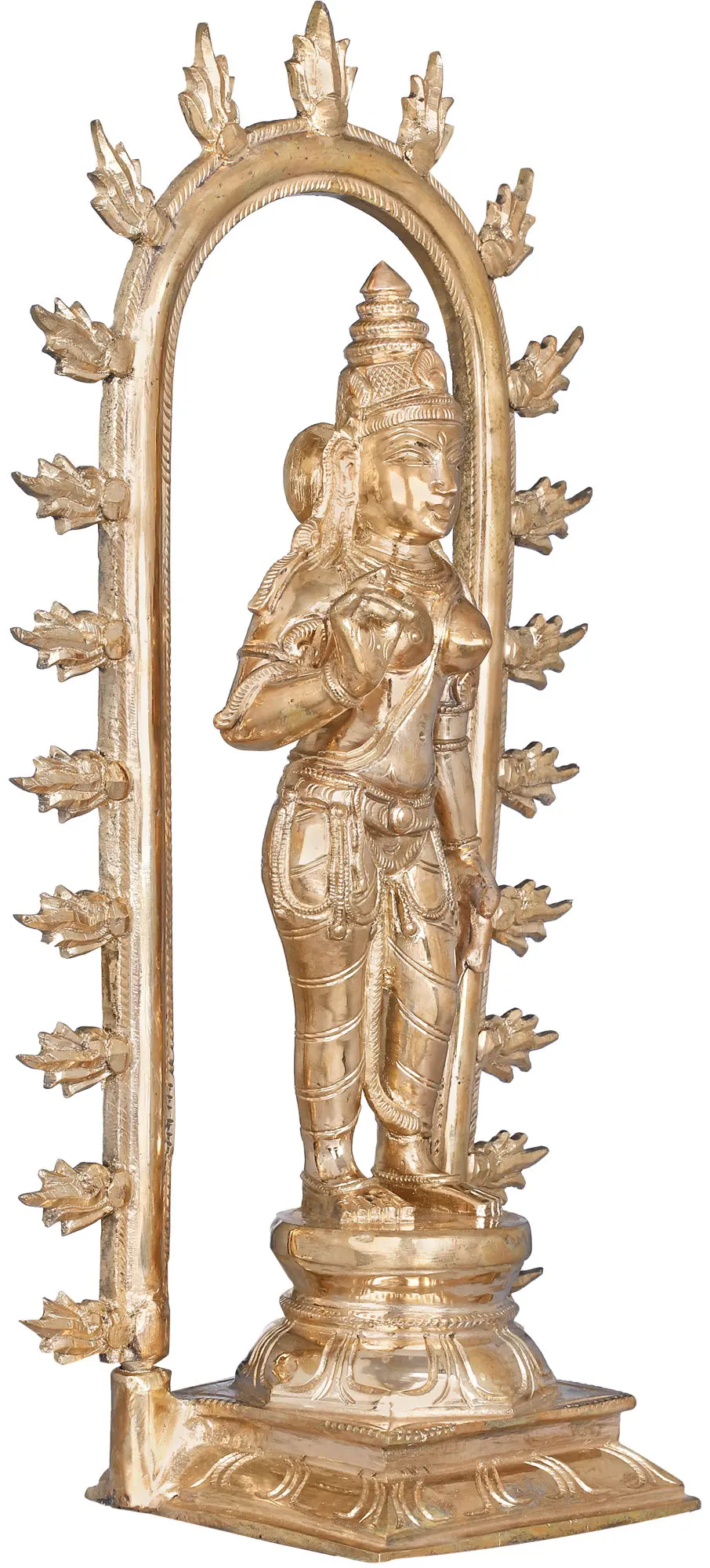 This exquisite bronze statue embodies the resplendent form of Devi Uma, a divine mother and a powerful goddess in Hinduism. Crafted in Swamimalai, a region renowned for its traditional bronze casting techniques, this Panchaloha (five-metal alloy) masterpiece is a testament to centuries of artisanal skill. The goddess stands within an ornate prabhavali, a radiant arch symbolizing her cosmic energy and divine aura. Each detail, from the delicate ornamentation to the serene expression on her face, speaks of devotion and reverence. The prabhavali itself is a marvel of craftsmanship, a celestial halo adorned with flame-like motifs, suggesting the ever-burning divine light that emanates from the goddess. This circular and flame-shaped design is deeply symbolic, often representing the cyclical nature of creation, preservation, and destruction, and the all-consuming nature of divine knowledge and power. The arched structure is reminiscent of temple gopurams, hinting at the sacred presence of the deity within a consecrated space. ––––––––––––––––––––