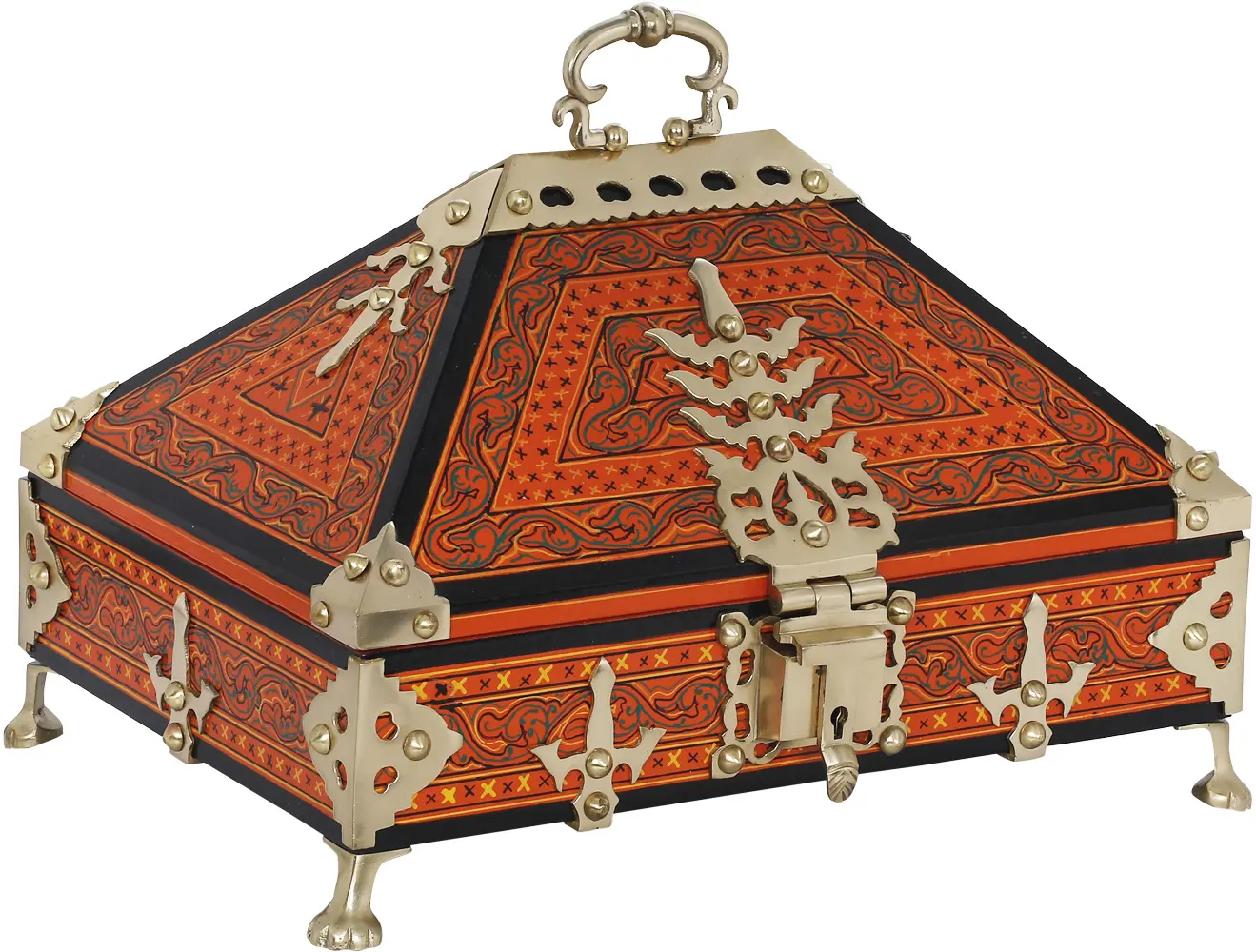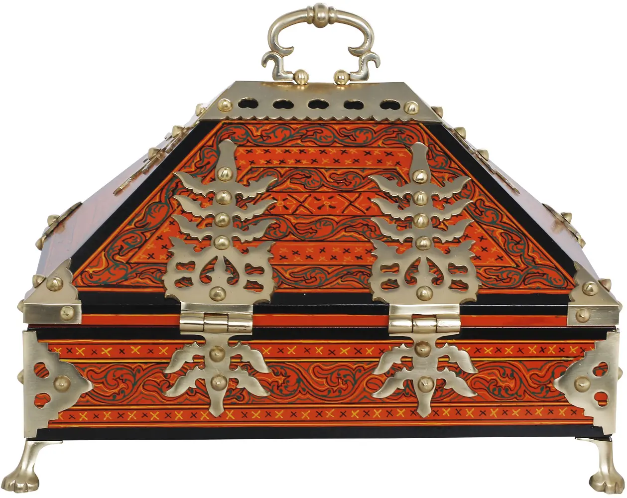 This exquisite ritual box, hailing from the vibrant land of Kerala, is more than just a container; it is a testament to profound spiritual practices and artisanal mastery. Crafted from fine wood and adorned with gleaming brass, its intricate design speaks of a rich heritage steeped in devotion. The triangular, pagoda-like structure evokes the sacred architecture of temples, inviting contemplation and reverence. The striking orange hue, often associated with auspiciousness and spiritual energy in Indian culture, pulsates with life, while the ornate black detailing and swirling patterns suggest a connection to the cosmic dance of creation and preservation.