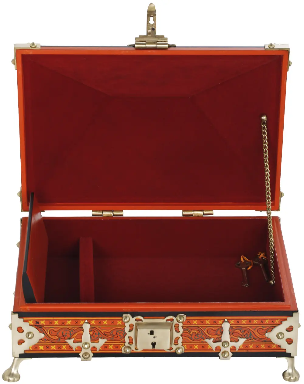The craftsmanship displayed in this ritual box is characteristic of the skilled artisans of Kerala, a region renowned for its wood carving and metalwork traditions that stretch back centuries. The detailed patterns, meticulously applied, are reminiscent of the intricate murals found in ancient temples and palaces, or the delicate designs etched onto traditional brass lamps. The brass fittings, from the robust latch to the decorative corner accents and the claw-like feet that elevate the box, are not merely functional but add a regal aura. These elements are not just decorative; they often carry symbolic meaning. For instance, the flame-like motifs adorning the front might represent Agni, the god of fire and destroyer of negativity, or symbolize divine knowledge illuminating the darkness. The overall aesthetic evokes a sense of opulence and sacredness, making this box a truly captivating piece.