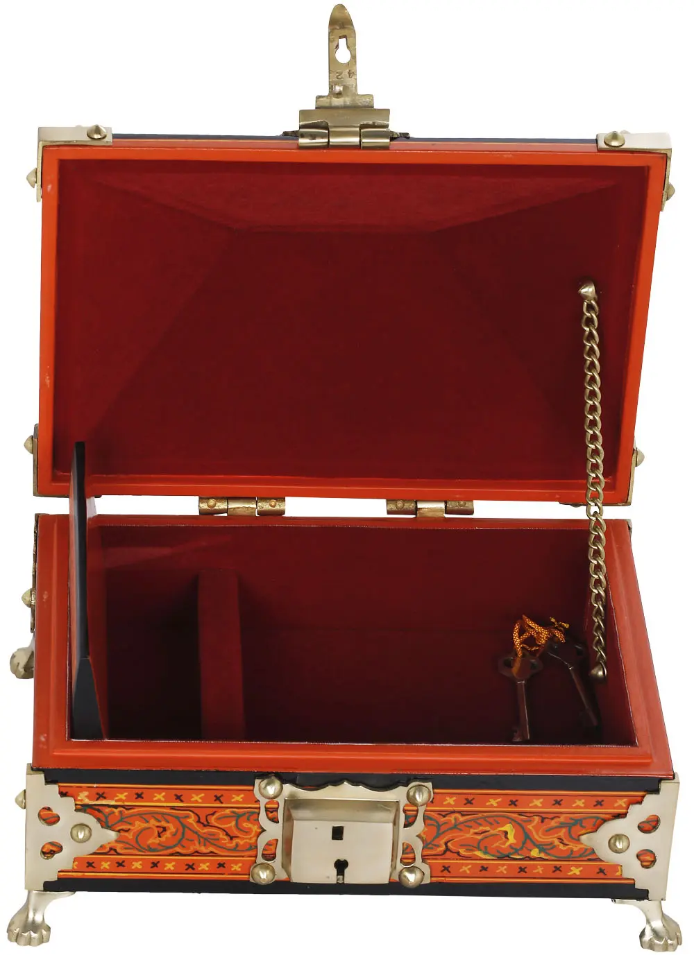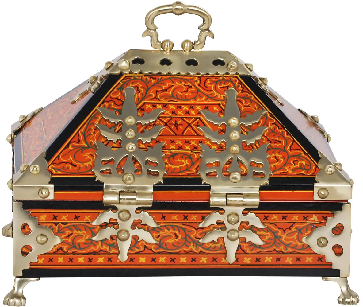 Step into a world where artistry meets devotion with this exquisite ritual box, a testament to the rich cultural heritage of Trivandrum. Crafted from a harmonious blend of fine wood and gleaming brass, this piece is more than just a container; it's a vessel for your most cherished sacred items, a guardian of your spiritual journey. Its striking octagonal form, reminiscent of ancient temple architecture, is adorned with vibrant, intricate patterns that speak of a lineage of skilled artisans. The rich orange hues, intertwined with delicate black lines and motifs, evoke the warmth of sacred fires and the depth of spiritual contemplation.